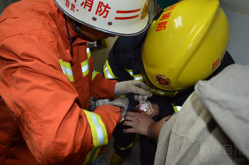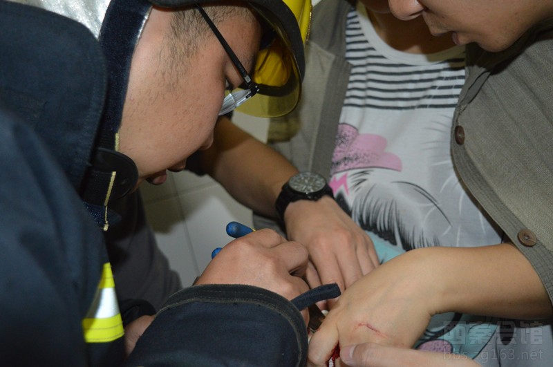 9月23日晚21时03分,钟云山路中队接到指挥中心调度称:位于檀木林第四人民医院有人手被卡住,具体情况不明,急需消防官兵前往处置,接警后,中队立即出动1车5人赶赴现场。 到达现场后通过与报警人了解,该妇女是自己妻子,由于在家中进行做饭时手指被一坚硬厨物卡住,无法取出,在家人的陪同下到来到自贡市第四人民医院治疗,在医生的建议下才打电话向119求助,希望得到消防官兵的帮助。 消防官兵经检查发现,此不明坚硬厨物有两部分组成:下面是一个把手,上面是一个像典型的钻戒样式,并且比较细小,经鉴定,该物品硬度比较高,恰巧紧紧卡于妇女的大拇指关节处,由于卡手时间过长,影响血液循环,手指肿胀,如不及时采取有效措施,妇女的手指将有可能造成更大的伤害。