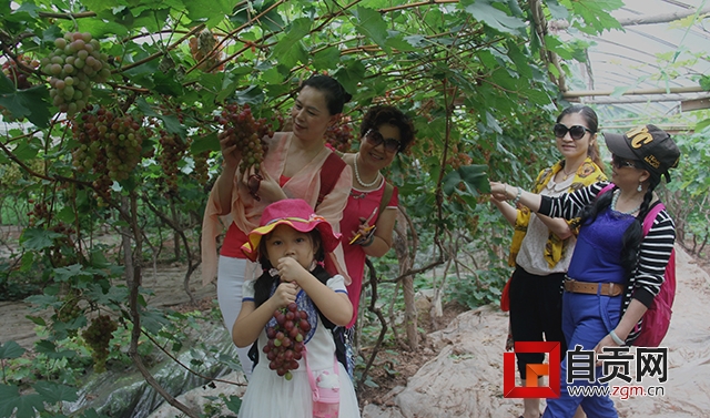 近年来,自流井区荣边镇立足优势,不断调整产业结构,全力打造沿伍富路和环旭水河休闲旅游观光产业带。先后发展葡萄、柑橘、玫瑰李、桃子等优质水果4350亩,建成特色水产养殖基地2100亩,花卉苗木基地2500亩,培育星级农家乐8家,田园采摘、休闲垂钓、特色餐饮为一体的休闲观光农业体系初具形态。图为游人在葡萄园开心采摘。(记者 曹湘黔 摄)