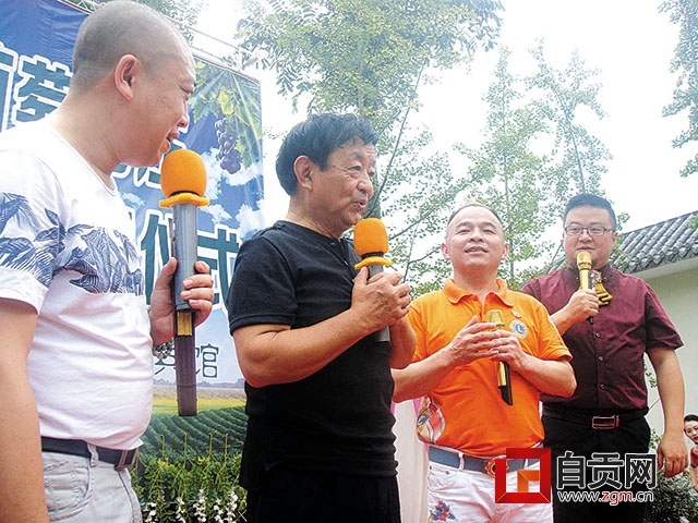 自贡网讯(张清明 记者 蒋周德 摄)近日,在自流井区某葡萄园采摘节开幕式上,巴蜀笑星巴登西饶应邀前来与弟子本土方言剧演员刘毅,宜宾农民歌手罗彪,以及市歌舞曲艺演艺公司编剧、演员徐崧,联袂表演了小品《我不是我》,及脱口秀。巴登西饶还和现场观众一同表演了脱口秀。