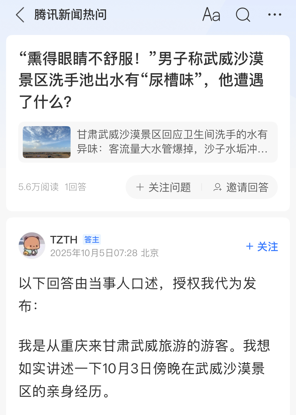 10月3日,有网友反映,甘肃武威沙漠景区,在景区卫生间洗手,“第一下出空气,第二下之后都是出有黄又泛白沫的水,洗完手上一股子油烟子和尿的臭味”,这名网友质疑,“出来的是未经过滤的尿水?”。在社交平台也有不少网友反映,武威沙漠景区卫生间洗手的水有异味。  厕所位置。图源/腾讯新闻热问。 游客周先生(化姓)在腾讯新闻热问上发声,称10月3日晚上7点左右,在景区内使用洗手池时,他按了第一下,没有出水,出来的是一阵风。朋友按了第二下,这次出水了,但流出来的竟然是黄色的水,里面还泛着泡泡。他没多想,伸手去洗了。洗完之后,他立刻闻到手上有一股极其难闻的臭味,“就是公共厕所里那种尿槽的味道,还夹杂着一种刺鼻的氨气味,熏得眼睛都不舒服”。  当事游客在腾讯新闻热问上发声。 据此前报道,景区工作人员回应,当天客流量大水管爆开了,水垢、水锈还有沙子冲出来了,所以造成了水有异味。对于这个回复,周先生表示质疑,”他跟我说是锈,不可能的,绝对是尿”,他希望景区调查清楚此事,给游客一个交代。 10月4日,潇湘晨报记者联系景区,工作人员依然否认,“就是冲下来的沙子,管道破裂已经修好了。”武威市文旅局的工作人员告诉记者,接到反映后他们联系了景区,工作人员称昨天有关部门已经采集了样本带走检测了,结果还没有出来,调查结果出来后会公布的。文旅局的工作人员称,景区正在联系游客协商,“游客掏的费用在权责范围内能免掉就免掉。” 潇湘晨报记者 钱嘉鑫