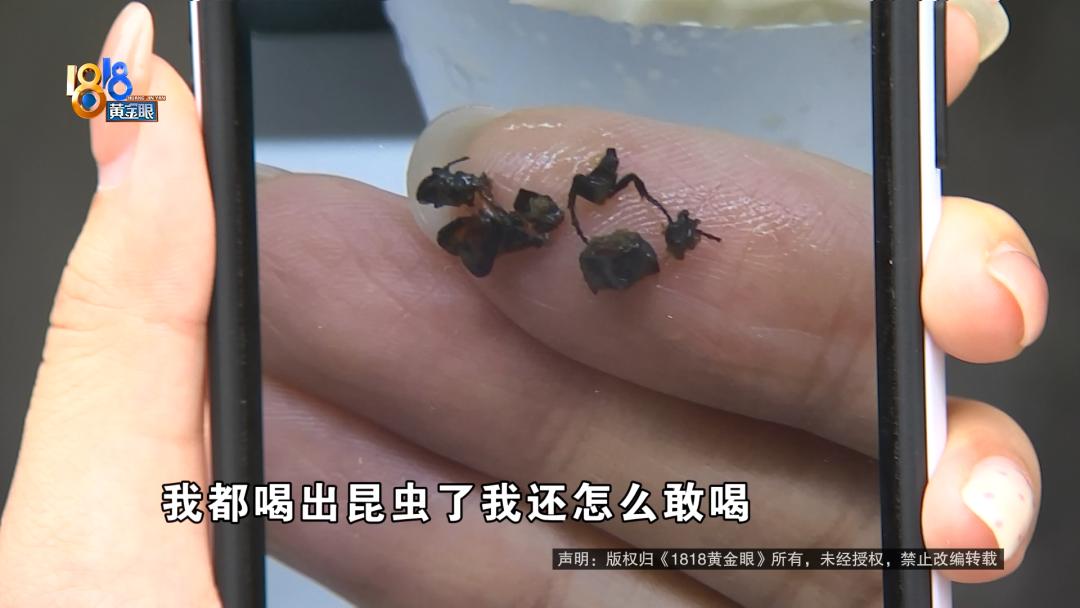 李女士反映,平时很爱喝的奶茶,这次突然喝到了不一样的东西。  KOI THE,这个奶茶品牌的中文名叫“可宜”,李女士是忠实顾客。官方小程序里成长值是1090,她说每消费一块钱积一个成长值,这还不包括她在其他平台上买的。  9月17号下午1点31分,李女士的男朋友通过外卖平台给她买了一杯可宜奶茶,实付18元。  李女士:当时他们店的订单比较多,等了一个半小时,(下午)3点钟送到我公司楼下外卖柜的。过了两三分钟我就下去拿上来了,喝了第一口就觉得很甜,给我第一直觉就是做错了,太甜了。我就想看一下杯身上有没有做错,结果发现没有平常点奶茶会有的标签。一般标签上会有你点的是什么,以及你加的料、你的糖度,还有这杯奶茶做的时间,但是都没有。  李女士提供了当时拍摄的视频,外卖袋和奶茶杯上都没有标签,订单中她的选项是中杯、少冰、不另外加糖、蔗糖、波霸,作为老顾客的她觉得甜度不对劲。  李女士:那我也不能说因为比较甜就扔掉,我就继续喝,想着等着里面冰块化掉一些、冲淡一下那个味道,不那么甜了。结果当我喝的过程中,就喝到一个口感类似钢丝球那样的、很硬比较扎嘴的东西,肯定是不会咽下去的,我就吐在手指头上,想看下是什么。吐出来之后就是黑色的几块,用手碾开就发现其中有昆虫的腿,腿上有毛,当时就比较恶心的。   李女士拍的照片中,有四五块黑色的碎片,其中一块还有两个锯齿状的物体。  她不确定是什么,把情况发在了网上引起了大家的讨论。有人说一开始以为是茶叶,直到看到了腿上的毛刺,有人说这不是蟑螂是天牛。估计采茶叶时一起带走了,生态好。    李女士说,她看到异物后联系了商家。 李女士:店长听了电话之后,言语中就是对我有一种质疑,就说你有什么证明这个虫子是里面喝出来的?然后说那这样吧,我把你这杯退了再赔你三杯。我说那我也不敢喝了,我都喝出昆虫了,我还怎么敢喝?12315是让市场监管局介入了,介入之后也就是调解,调解过程中商家就一直不承认这个东西。  李女士说,最早发现标签不对、口味太甜的时候她就向商家申请退款,被拒绝了。直到第二天,平台退款并补偿了一个红包,可宜奶茶浙江区域的负责人也跟她联系过。  李女士:一开始其实我的诉求并没有一定要求《食安法》那么严格赔偿我,但他们态度导致我现在就坚持用法律程序维护正义。他们就不同意,这个负责人说以个人名义赔偿我300元,我不接受。 KOI THE(可宜)奶茶浙江区域负责人 胡经理:门店的外卖单比较多,前面一个骑手把这一单拿错了,这个是有监控的。我们这一单找不到了,是不是应该重新做一杯?重新做的一杯就是送到顾客手上的这一杯。 李女士:他的意思是我收到的为什么没有标签、没有封口签、没有外卖单,就是因为重新做的。 KOI THE(可宜)奶茶浙江区域负责人 胡经理:对,因为我们给顾客做是比较着急的情况下。我看了监控,这杯饮料就是没加糖的,本身料就是甜的。顾客说甜,因为口感这个东西每个人都不一样。  胡经理表示,饮品没有问题,门店拒绝了退款。过了四五十分钟后,顾客反映了虫子的问题。此前的采访中李女士提到过,她当时想等冰块化掉冲淡味道,之后发现了异物。  KOI THE(可宜)奶茶浙江区域负责人 胡经理:我们肯定是先自查,第二天食药监也来我们门店调取了所有东西,食材记录、健康证、营业执照、泡制每一杯饮品的食材记录,我们内部是没有发现有进入这个异物的方式的过程。 记者:你们觉得她喝出来的是什么东西? KOI THE(可宜)奶茶浙江区域负责人 胡经理:我们没办法断定喝出来是什么,客人喝到这个,我们可以给她退款,首先不管这个东西是什么,或者是不是我们饮料里出现的,最起码顾客体验不好。  负责人表示,市场监管部门一直在中间做协调,也需要顾客提供监控视频来证明,但顾客没有提供完整证据链。 李女士:正常消费者思维,点到了就吃,拿到了就喝,不会说从开封之前360度检查、喝的过程中全程录像,我又不是自媒体。对他们来说,我的诉求就是在小红书(帖子)下面对我进行一个回应,以及我会正常走法律程序,达到我《食安法》的赔偿诉求。 KOI THE(可宜)奶茶浙江区域负责人 胡经理:道歉,我已经道过好几回歉了,都有录音的。刚刚说她在小红书这个平台诉求,不管其他公司是怎么处理的,这个方式我们接受不了。  负责人表示,还是只能以个人名义补偿300元,李女士不接受,表示会通过法律程序解决。 来源:1818黄金眼