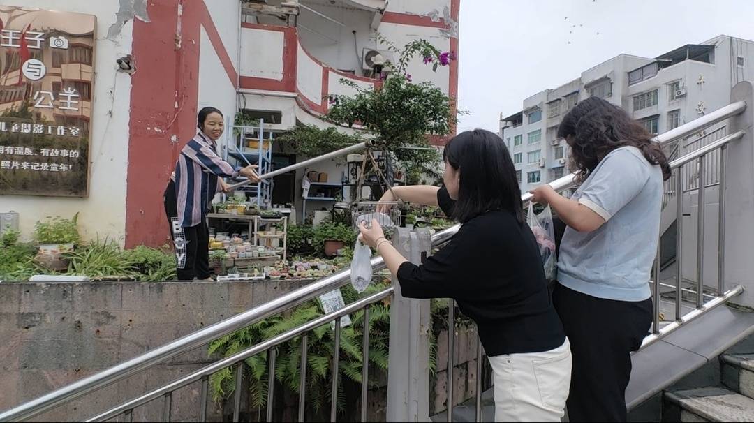 说起网上说的“多肉商店”一事,刘超蓉说,她每次在露台上打理多肉时,总有人扶住天桥的护栏围观。“有些孩子上学的老人,向我讨要多肉种子。”刘超蓉说,她就向路人送多肉。由于露台与天桥之间有1米多的距离,她就找来网兜进行投递。