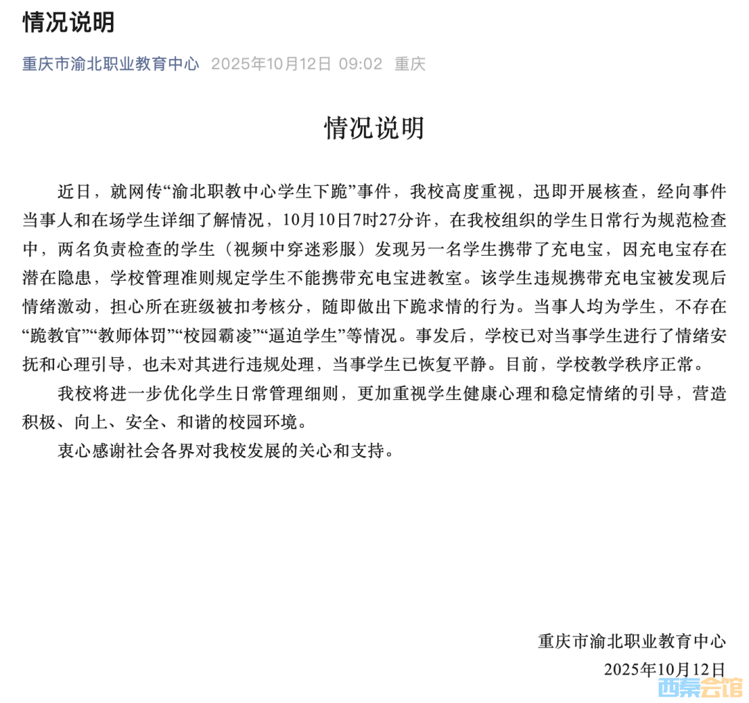 近日,就网传“渝北职教中心学生下跪”事件,我校高度重视,迅即开展核查,经向事件当事人和在场学生详细了解情况,10月10日7时27分许,在我校组织的学生日常行为规范检查中,两名负责检查的学生(视频中穿迷彩服)发现另一名学生携带了充电宝,因充电宝存在潜在隐患,学校管理准则规定学生不能携带充电宝进教室。该学生违规携带充电宝被发现后情绪激动,担心所在班级被扣考核分,随即做出下跪求情的行为。当事人均为学生,不存在“跪教官”“教师体罚”“校园霸凌”“逼迫学生”等情况。事发后,学校已对当事学生进行了情绪安抚和心理引导,也未对其进行违规处理,当事学生已恢复平静。目前,学校教学秩序正常。