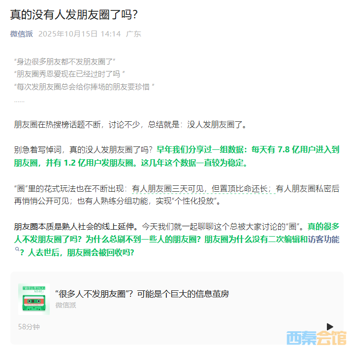 据第一财经消息,微信公关总监在微信派播客中回应“很多人不发朋友圈了、朋友圈是不是真的凉了”的言论表示,这是个人的感受,有点像信息茧房。