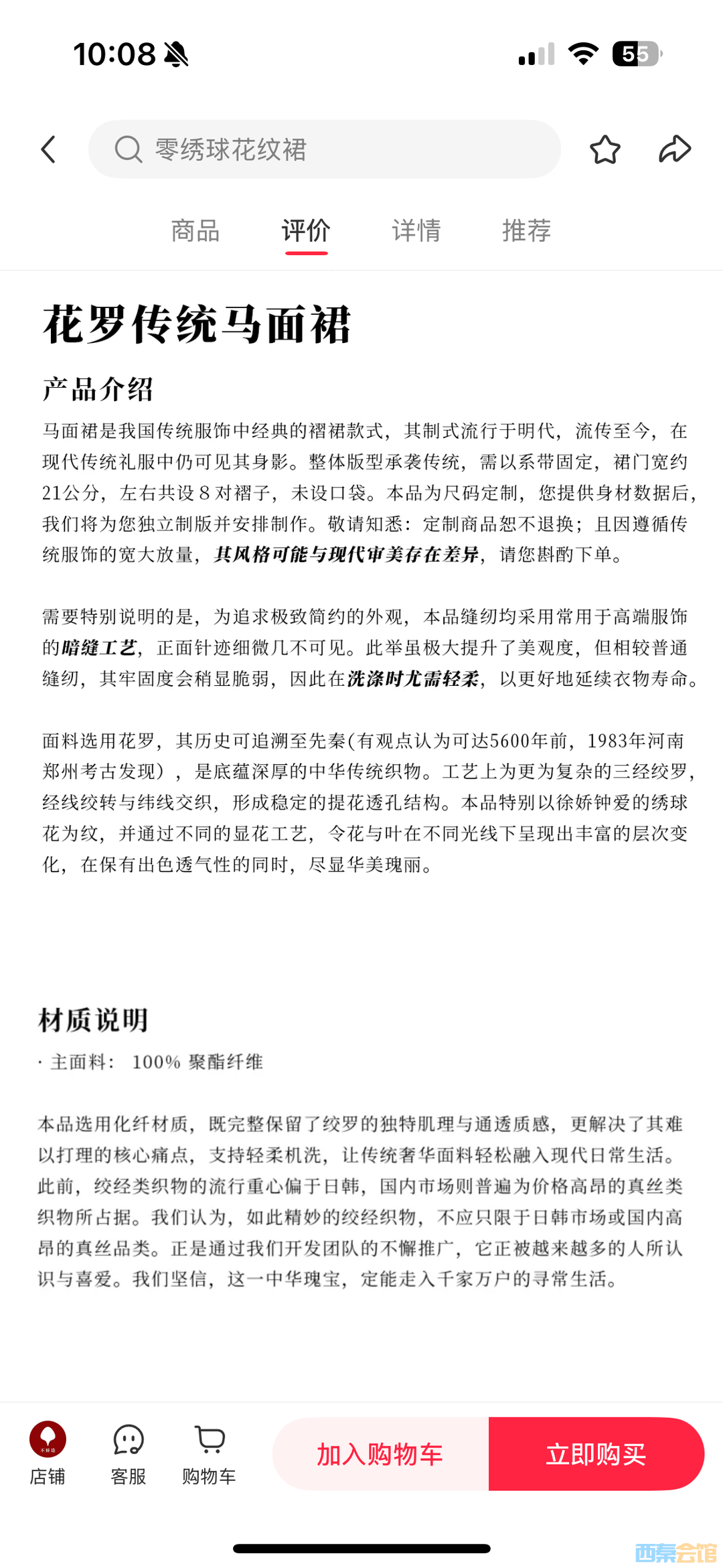 据了解,争议焦点为该品牌推出的“花罗”款式马面裙,官方折后价格为1665元,主打“一人一版”定制概念。其宣传页面中多次提及“花罗”“传统绞经工艺”等专业术语,配图所呈现的透光质感也令不少消费者联想到真丝绸缎。然而,从销售数据来看,该款产品市场接受度有限。
