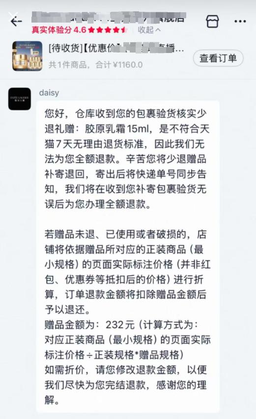 封面新闻记者 杨金祝 实习生 龚善美 今年“双十一”购物节已拉开帷幕,然而“退货被指少退赠品”的问题,正成为许多消费者的共同困扰。 10月30日,谢女士向封面新闻反映,她在网上“雅诗兰黛官方旗舰店”申请退货时,被商家以“赠品缺失”为由,要求从退款中扣除232元。 尽管她提供了退货打包视频与包裹重量凭证,商家起初仍拒绝沟通,直至她在社交平台曝光此事,才最终获得全额退款,“但他们只是退了钱,没有一句‘对不起’,就像什么都没发生。” 退货被告知“赠品缺失” 有视频为证,仍难自证清白 10月24日,谢女士在某电商平台“雅诗兰黛官方旗舰店”购买了一套价值1160元的胶原乳霜套装,包含一瓶75ml正装及5瓶15ml小样。因对产品不满意,她于10月26日申请退货。 “我此前看到过类似情况,所以特意全程录制了打包视频,并核对了包裹重量,确认所有商品都已放入。”谢女士说。  谢女士称赠品内容全部寄回。图据打包视频截图 然而,10月29日,商家在收到退货后联系她,称仓库验货发现“少一瓶15ml面霜小样”,因此无法办理全额退款,需按正装价格扣除232元,或拒收整个包裹。  谢女士与商家客服沟通内容。图据受访者  谢女士与商家客服沟通内容。图据受访者 “他们没有任何证据,就直接判定我少退。”谢女士要求商家提供内部的拆包视频以核对,但客服以“内部拆包视频无法提供”为由拒绝进一步沟通。 多次申诉无果后,谢女士于10月30日在社交平台发帖曝光此事,引发广泛关注。次日,商家售后工作人员主动联系她,承诺优先退款。10月31日,她收到全额退款。 谢女士表示,她的诉求远不止于退款,更希望商家能就误判行为道歉,并公开其验货流程。 多人遭遇相似 赠品计价引争议 谢女士的遭遇并非个例。记者在社交平台搜索发现,多位消费者反映在雅诗兰黛退货时被扣除“赠品款项”,且扣费金额引发争议。 有消费者晒出截图称,一个0.5ml的试用片装小样,竟被按22.7元计价扣款,令人质疑:“不是赠品吗?为什么退款时还要算钱?甚至算得比正装还贵?” 根据商家对部分消费者的解释,若赠品未退、已使用或者破损的,店铺将依据赠品所对应的正装商品(最小规格)的页面实际标注价格(并非红包、优惠券等抵扣后的价格)进行折算,订单退款金额将扣除赠品金额后予以退还。 就此类问题,记者联系了雅诗兰黛官方旗舰店客服,店铺客服表示“问题超出权限”。截至发稿,商家未对退货审核及仓库验货流程作出具体说明。 律师: 消费者保留的证据材料要丰富 可向市场监管部门投诉 陕西恒达律师事务所高级合伙人、知名公益律师赵良善认为,若遭遇“退货被指少退赠品”的情况,消费者可以通过以下方式维权:首先,应注重保留证据,除了完整的退货打包视频与包裹重量凭证外,还应保存商品详情页、促销广告、订单页面截图等,明确赠品的数量、规格等信息,以及与商家的所有沟通记录,如聊天记录、客服通话录音等,这些都可以作为维权的有力证据。 其次,主动与商家沟通,向其说明自己已经按照要求退货,提供了相关证据,要求商家重新核实。可以引用相关法律法规,如《消费者权益保护法》等,指出商家在没有充分证据的情况下,无权扣除赠品款项。若商家以内部流程等为由拒绝沟通或不提供拆包视频,可明确告知其行为不符合法律规定,要求其承担举证责任。 再者,如果与商家协商无果,可以向电商平台投诉,说明情况并上传所有证据,要求平台介入处理。根据《电子商务法》第六十一条规定,平台有义务督促商家履约,平台通常会根据双方提供的证据和平台规则进行判定。 若平台处理结果不满意,消费者可以向商家所在地的市场监管部门投诉,或直接诉诸法院,通过法律途径维权其合法权益。 封面新闻“求助报料平台”