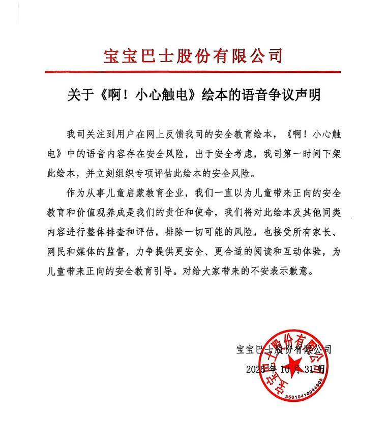 封面新闻记者 曹菲 近日,有网友发视频反映,宝宝巴士出品的《啊!小心触电》儿童绘本搭配的点读笔音频中,存在诱导孩子把手插进插座孔的歌词。11月1日,宝宝巴士网络旗舰店客服回复,相关歌词已被修改,用户可删除点读包后重新下载。 根据网友发布的视频,在《啊!小心触电》儿童绘本中,出现“我(电)在插座孔里,小手插进来就能看到我”的歌词,认为存在诱导孩子把手插进插座的风险。有网友在评论区反驳,后续歌词有“危险,不能插进去”的提醒,但大部分网友仍担心低龄儿童认知能力有限,可能只会记住危险内容。  绘本中有“小手插进来就能看到我”的诱导歌词 10月31日晚,宝宝巴士官微发布关于《啊!小心触电》绘本的语音争议声明 ,表示“出于安全考虑,我司第一时间下架此绘本,并立刻组织专项评估此绘本的安全风险。”  宝宝巴士就争议歌词发布声明 11月1日上午,记者通过宝宝巴士网络旗舰店咨询此事,客服回复称,当前团队已优先制作以正面引导为主的新版本,已经更新了点读内容,用户删除点读包后重新下载即可。 修改后的歌词: V1 嘿 我就是电 很危险的电 住在每个人家里 能不能把小手插进插座孔里呢? V2 不行不行 这样很危险 小心电会啪滋 “碰!” 不要把小手 插进插座孔 保护好自己 杜兵说:插座孔里有电,不要把小手插进去噢