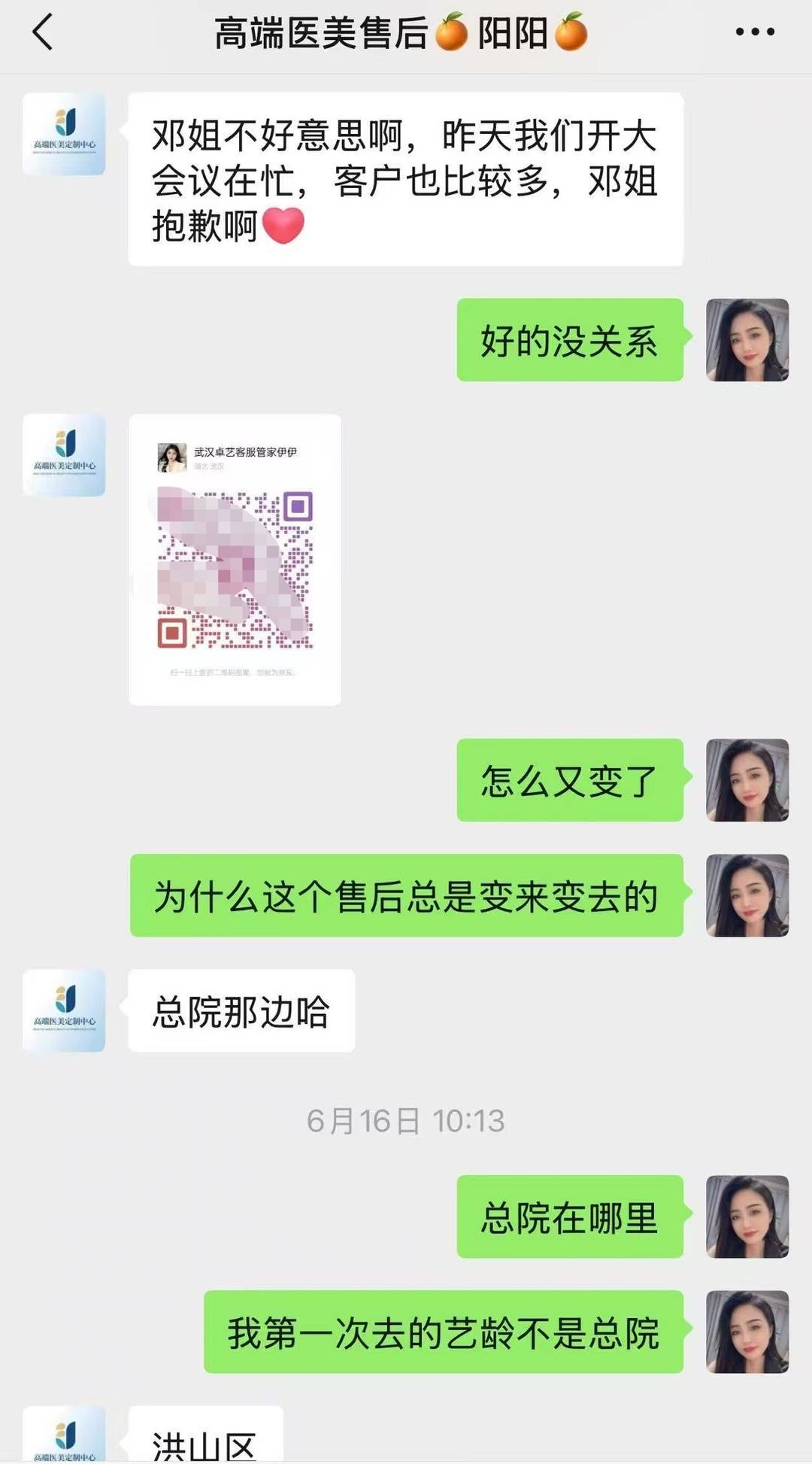 因术后效果不佳,并且眼窝出现胀痛的硬块。邓女士多次向客服人员反馈,对方邀请她返回艺龄修复两次,依旧效果不佳。“后来,又说有专家来武汉坐诊,分别安排我到武汉恒美、武汉悦颜、武汉卓艺3家机构修复,说这些机构是艺龄整形医院的总院、分院。还是没有效果。”
