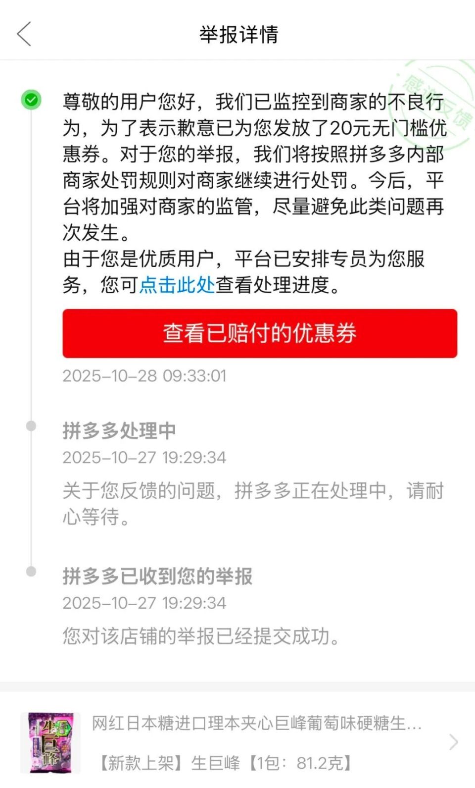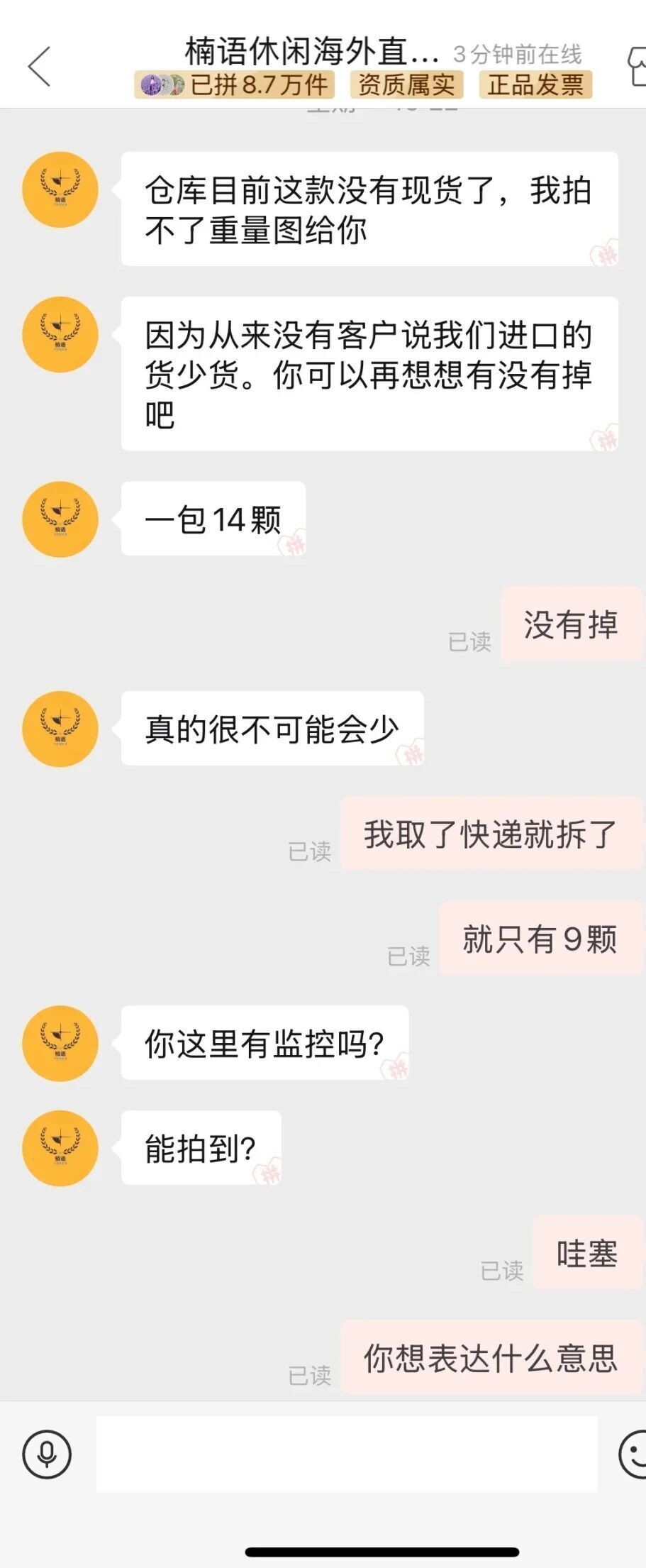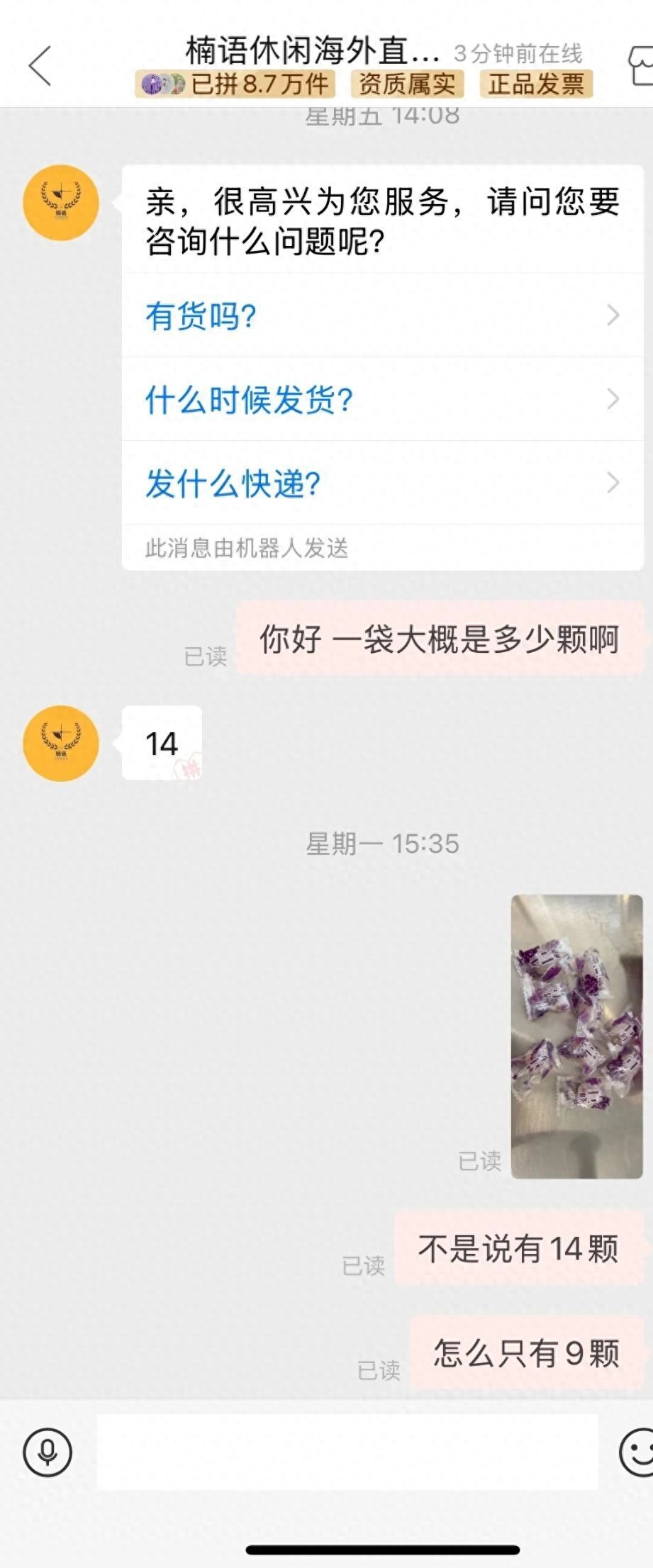 10月29日,四川成都。李姚(化名)反映,她于10月24日在拼多多平台的“楠语休闲海外直属店”购买糖果,商品简介中明确标明糖果克重为81.2克。 李姚询问一袋糖果大概有多少颗,商家王凯(化名)答复14颗。 10月27日,李姚签收后,发现糖果仅有9颗,少了5颗。  把9颗糖果与包装袋一起称重后仅有61.5克,与商品简介不符。李姚询问王凯,为什么少了5颗糖。 王凯称,第一次遇到客户说少糖,怀疑是李女士私藏糖果。  随后,李姚向拼多多客服反映该事件。 10月28日,拼多多客服认为王凯存在服务态度问题,对王凯的网店进行整改处理。 补偿李姚4张共计26元优惠券。  10月28日晚,李姚单位的老板收到一条好友申请,老板添加后,发现是王凯。王凯告诉老板,怀疑员工李姚私藏糖果,要求老板提供李姚在单位的拆快递视频。  王凯看李姚拆包监控视频,发现确实只有9颗糖。 李姚认为,自己如实与店家沟通,却被怀疑是“小偷”,王凯还加单位老板微信“告状”,影响到她身边人与工作。 10月29日,王凯告诉记者,自己在联系他们老板这件事上确实不对,但自己的怀疑并非空穴来风,“我们卖的是预包装的食品,又不是农副产品,不存在故意少发货的情况。” 王凯表示,现在也说不好是5颗糖去哪了,李姚有监控视频,但他卖的是包装好的进口零食,“我自己也觉得很诧异。” 至于为何要添加李姚单位老板,王凯表示,当时确实是有点生气,“我被投诉了之后,影响了店铺评分,还被罚了款,这种包装的食品,又不可能存在缺斤少两。” 目前,李姚已经申请退货退款。 来源:正在新闻