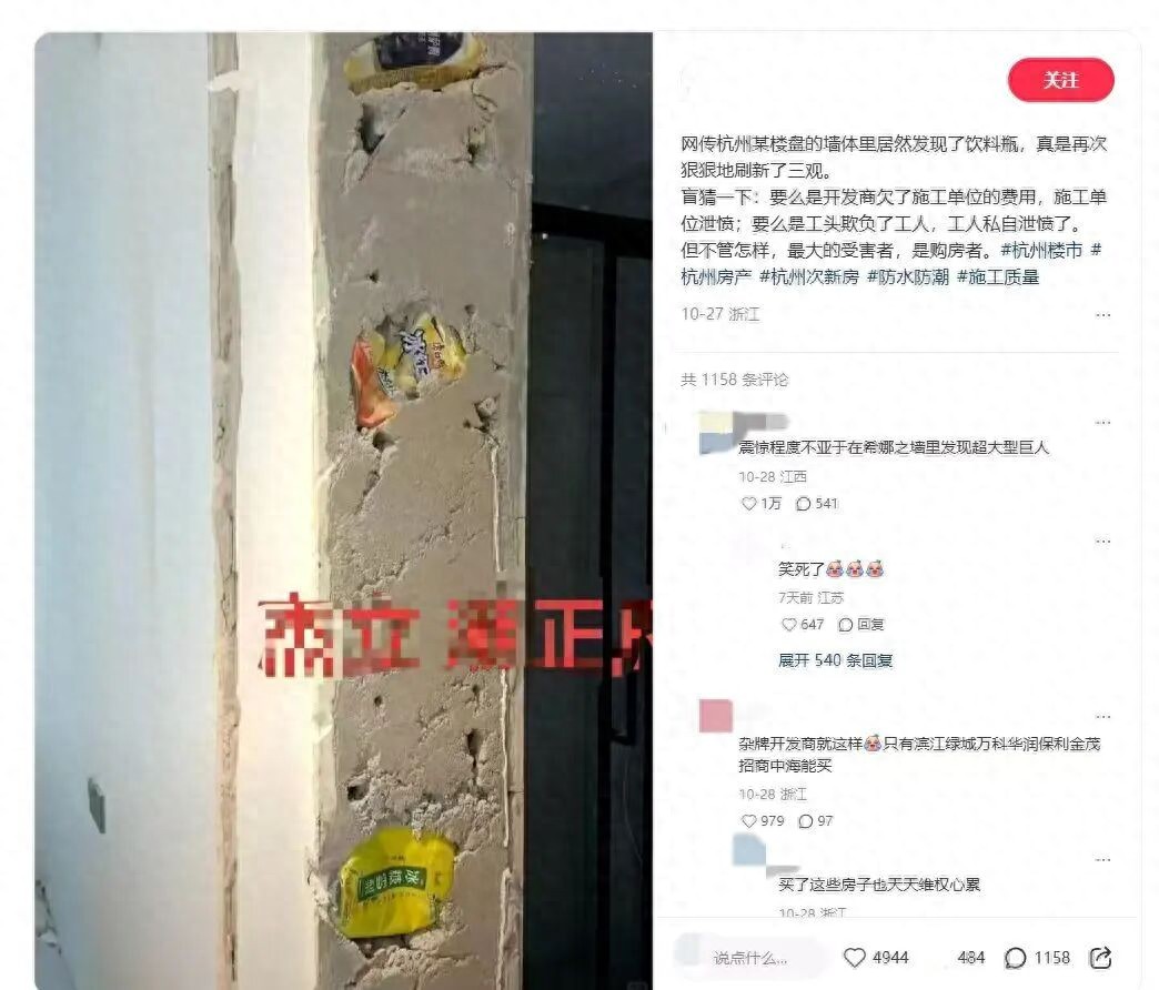 年关将近,杭州楼市交付大潮来临。上城区杰立潮正府小区一业主,在进行房屋改造时惊奇地发现,临近门框的墙体里竟然藏有多个饮料瓶,引发了对房屋质量的担忧。  潮正府位于笕桥板块,2022年9月拿地,楼面价19593元/㎡,住宅精装限价35000元/㎡。小区共规划有352套住宅,户型面积89-116㎡,在2023年下半年四次集中开盘,房源逐步售罄,并于2025年10月正式交付。 为何会有饮料瓶藏在墙体里?新交付楼盘,开发商应如何检查与保证验收,又该承担什么样的责任? 对于相关情况,上城区住房和城市建设局回复:经核实,网传视频中的墙体为卫生间分隔墙,不涉及建筑主体结构。问题系施工人员在填充门套缝隙时,使用饮料瓶作临时支撑且未及时清除,违反施工工艺。区质安站委托杭州市建筑工程质量检测中心现场踏勘,确认该部位为非承重墙,不影响结构安全。 本次问题的责任主体为项目施工总包单位杰立建设。其在装修后期施工作业过程中违反相关施工工艺,导致问题发生。区住建局已约谈开发商、施工及监理单位,并对施工单位和监理单位进行信用扣分。项目建设单位已对施工单位、监理单位及管理责任人处以经济处罚。 据了解,当前开发商和施工单位已对涉事墙体完成整改。事件发生后,项目已安排专人在客服群和现场受理业主诉求。截至11月4日,潮正府共有26户业主对此情况开展复查复测:一是区质安站在尚未交付的17户中随机抽取了3户;二是有20户业主进行了装饰报修,已经全数检测;三是有3户业主进行了自行拆改,已经全数检测。以上所涉及的26户,在复测过程中均未发现同类问题。 截至记者发稿前,开发商方面回复表示:已完成整改维修,并向该业主致歉,已获得该业主谅解。积极配合其他有疑问的业主开展查验等工作。相关工程人员通过调查施工记录、随机抽检等方式进行自我排查,未发现类似事件。对于此次事件中的相关责任单位及人员,进行了处罚。 来源:潮新闻 |