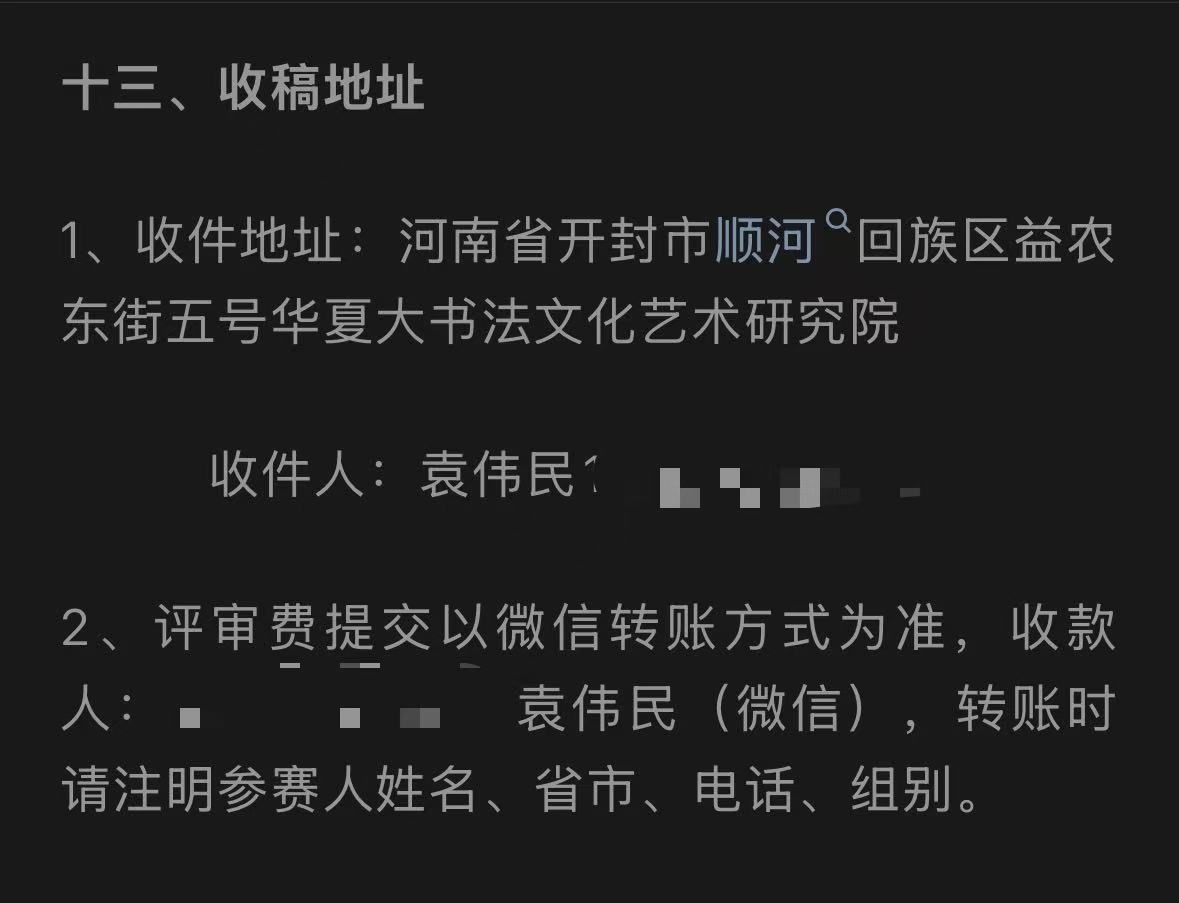 近日,有网友反映在首届“华夏杯”全国书法大赛公示的获奖名单中,大量获奖者的名字与百度文库中“10000中国普通人名大全”中的名字一致。   根据网传获奖名单,记者发现,在成人组特等奖、一等奖、二等奖等奖项获奖名单中,获奖者与百度文库“10000中国普通人名大全”的人名几乎一致,此事引发广大网友讨论。有网友表示,“你们获奖人名百度复制的?骗取报名费?”,还有网友表示,“神人,获奖人员都能编。”    记者搜索发现,获奖名单公示于公众号“书画展赛”上,但是征稿启事却发布于“书法学习指南”、“书法艺站”等公众号,且启事中的截稿时间也有不同。  根据公众号“书法学习指南”发布的征稿启事,该书法大赛主办单位为华夏大书法文化艺术研究院,征稿对象:全国书法家、书法爱好者均可投稿,本届大赛分为成人组和学生组,同时设置有奖金:成人组特等奖1000元/人,一等奖500元/人……,同时本赛事每幅作品收取30元评审费,未交评审费的作品不参与评奖。记者注意到评审费提交以微信转账方式为准,收款人为袁伟民,袁伟民同时为本赛事组委会主任。   12月4日,记者多次拨打征稿启事中袁伟民的两个电话,未获接通。记者随后拨打征稿启事中注意事项里留的举报电话,一主办方男性工作人员表示,“这个(获奖名单)我们也没有发布,有其他人把这个发布了,没有在咱官方公众号发布。”记者表示并未查询到主办方相关公众号,男性工作人员表示,“(官方公众号)审核一直没有通过。” 关于网传获奖名单引发关注一事,男性工作人员介绍,“有的书友不想参赛了,要退费。”并表示已给部分参赛者退费,“会有一个说明。”随后该男性工作人员挂断电话。 记者继续拨打该电话,一名女性工作人员接电后表示,“有个合伙人拿钱跑路了,袁老师(袁伟民)把钱都退回去吧。”女性工作人员表示,目前袁伟民自己垫付,陆续把钱退回参赛者。 天眼查显示,华夏大书法 (厦门) 文化艺术研究院 (有限合伙) ,成立于2025年,位于福建省厦门市,是一家以从事文化艺术业为主的企业。执行事务合伙人为袁伟民。 潇湘晨报记者朱天翔 段颖琪