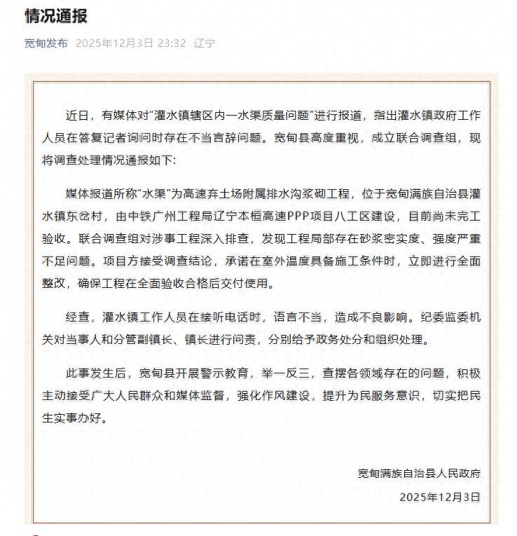 通报全文如下: 近日,有媒体对“灌水镇辖区内一水渠质量问题”进行报道,指出灌水镇政府工作人员在答复记者询问时存在不当言辞问题。宽甸县高度重视,成立联合调查组,现将调查处理情况通报如下: 媒体报道所称“水渠”为高速弃土场附属排水沟浆砌工程,位于宽甸满族自治县灌水镇东岔村,由中铁广州工程局辽宁本桓高速PPP项目八工区建设,目前尚未完工验收。联合调查组对涉事工程深入排查,发现工程局部存在砂浆密实度、强度严重不足问题。项目方接受调查结论,承诺在室外温度具备施工条件时,立即进行全面整改,确保工程在全面验收合格后交付使用。 经查,灌水镇工作人员在接听电话时,语言不当,造成不良影响。纪委监委机关对当事人和分管副镇长、镇长进行问责,分别给予政务处分和组织处理。 此事发生后,宽甸县开展警示教育,举一反三,查摆各领域存在的问题,积极主动接受广大人民群众和媒体监督,强化作风建设,提升为民服务意识,切实把民生实事办好。