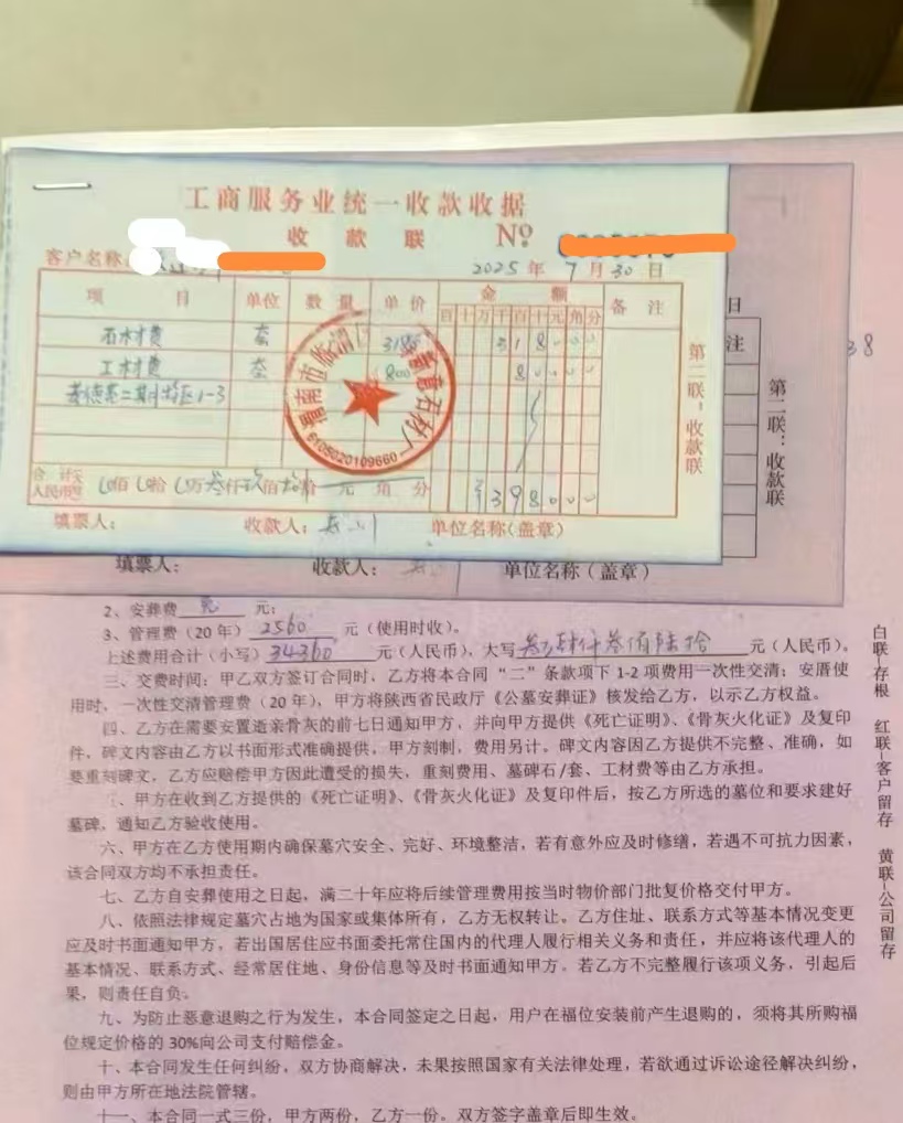 家人前往渭南临渭区龙寿山生态公墓精心挑选了两个相邻的墓位,当时以每个墓位费用包括石材费、公材费、刻字费及20年服务费共计34360元。他们以这个价位购买两个相邻的墓位,一共支付了近7万元。