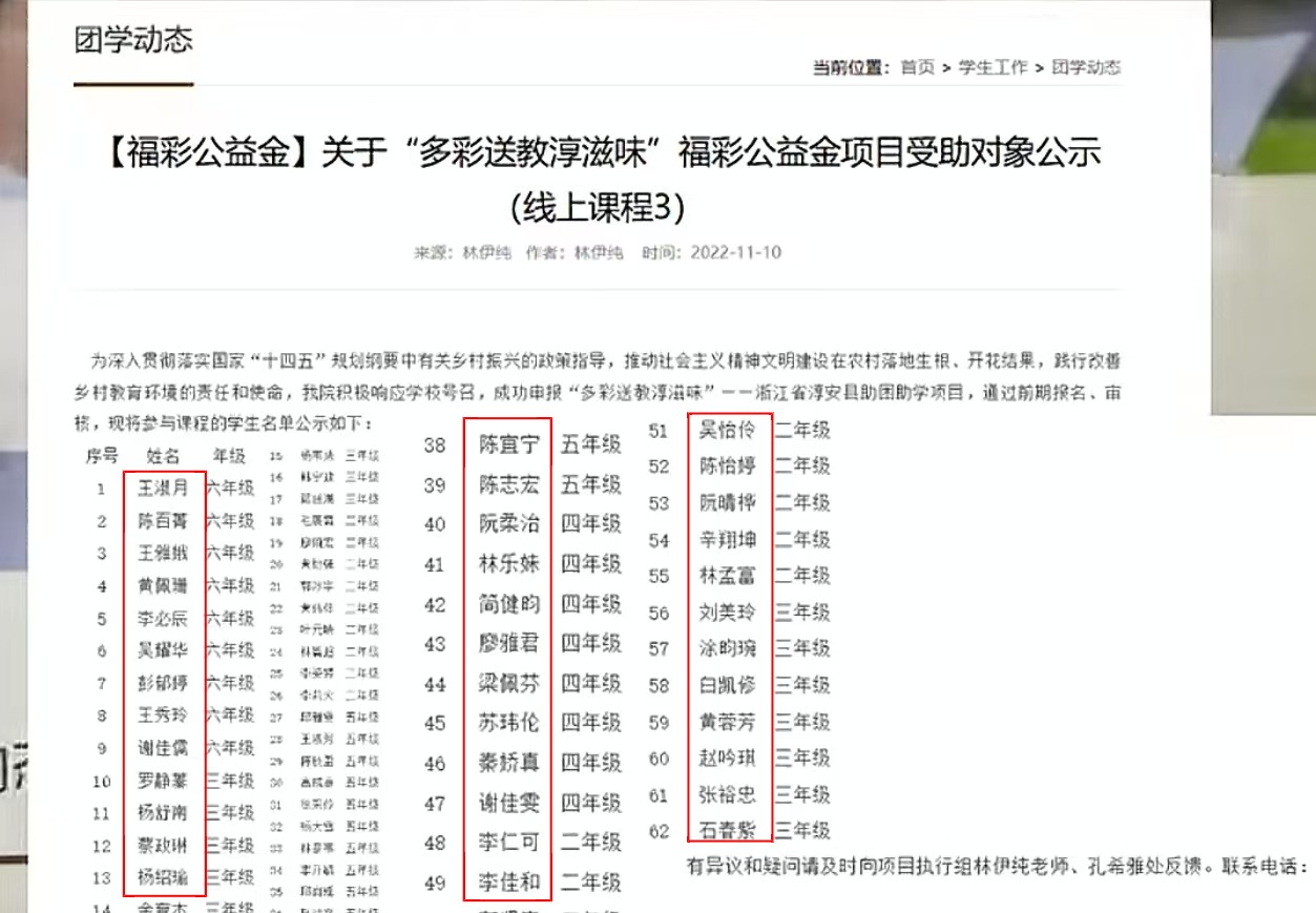 潇湘晨报此前报道,12月3日至4日,多网友扒出书法比赛、声乐比赛获奖名单、政府招投标项目评审员名单、执法局行政处罚名单作假,名单中的人名均来自于百度文库《10000中国普通人名大全》这一文档。 12月5日,又有网友注意到,杭州师范大学人文学院官方网站发布的福彩公益金项目受助对象公示中,名单里的部分人名也出自《10000中国普通人名大全》。   △杭州师范大学人文学院官网公示的截图  △《10000中国普通人名大全》截图 据悉,该校的福彩公益金项目名为“多彩送教淳滋味”——浙江省淳安县助困助学项目,几则受助对象公示分别发布于2022年及2023年。潇湘晨报记者在网上搜索发现,该校大学生曾至杭州淳安县农村进行暑期支教活动。 12月5日,潇湘晨报记者致电杭州师范大学人文学院综合办,及公示中留下的项目执行组电话,截至发稿,电话均未接通。 记者随后致电中国福利彩票服务热线,客服表示,销售彩票的钱均上交财政部和民政部,中国福利彩票方没有分配该收益的权力。 目前,杭州师范大学人文学院官网已将上述几则福彩公益金受助对象公示删除。  据中国福利彩票官方网站,彩票公益金的来源分为两部分:一部分是按照国家规定比例从彩票销售取得的资金中提取的一部分资金;一部分是逾期未兑奖的奖金,彩票资金是指彩票销售实现后取得的资金,包括彩票奖金、彩票发行费、彩票公益金,其构成比例由国务院决定,彩票公益金按照政府性基金管理办法纳入预算,实行收支两条线管理,专项用于社会福利、体育等社会公益事业,结余结转下年继续使用,不得用于平衡财政一般预算。逾期未兑奖的奖金纳入彩票公益金。彩票公益金的分配政策,由国务院财政部门会同国务院民政、体育行政等有关部门提出方案,报国务院批准后执行。 潇湘晨报记者段颖琪