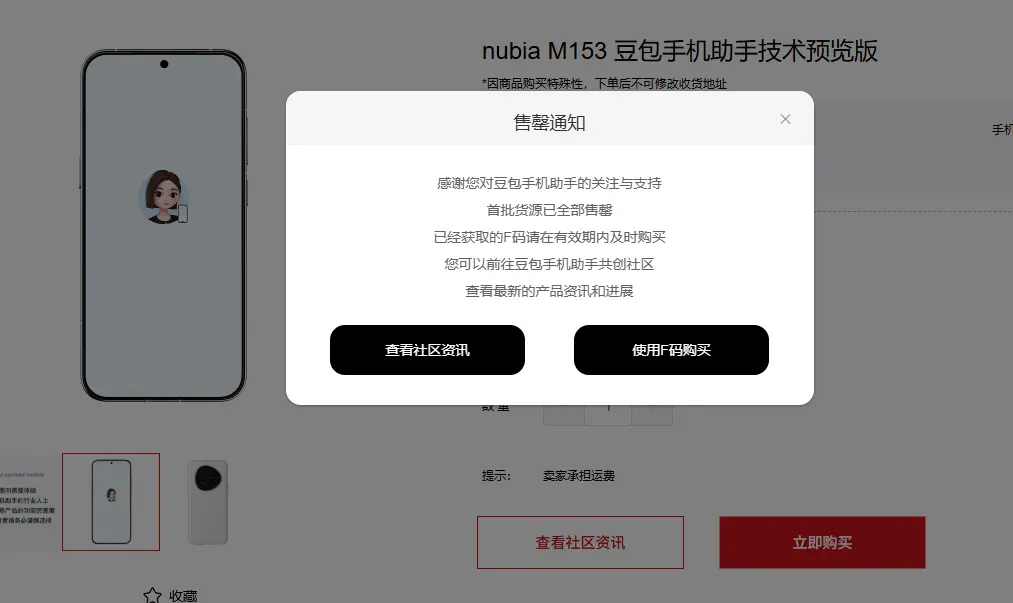 12月16日,根据中兴商城官网显示,豆包手机助手及合作机型nubiaM153目前已重启F码候补申请通道,正式恢复产品购买资格。