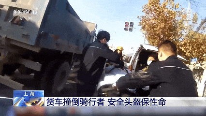 所幸骑行者佩戴了安全头盔,且货车处于空载状态,才得以逃过一劫。