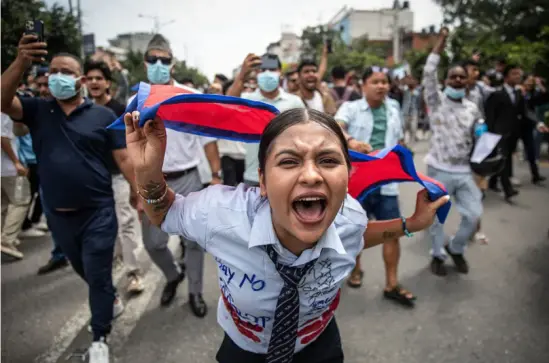▎2025年9月8日,一名示威者在尼泊尔议会大楼外高呼口号,抗议政府的社交媒体禁令及腐败问题。图源:法新社