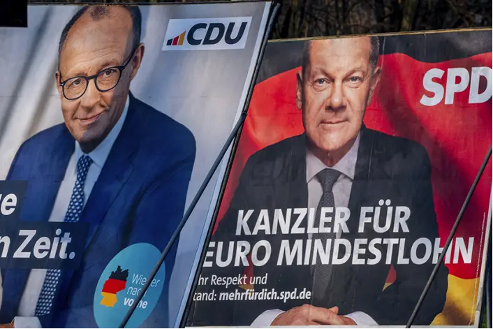 ▎当地时间2025年2月8日,德国时任总理朔尔茨(右)和德国联盟党总理候选人弗里德里希·默茨(左)的选举海报。图源:视觉中国