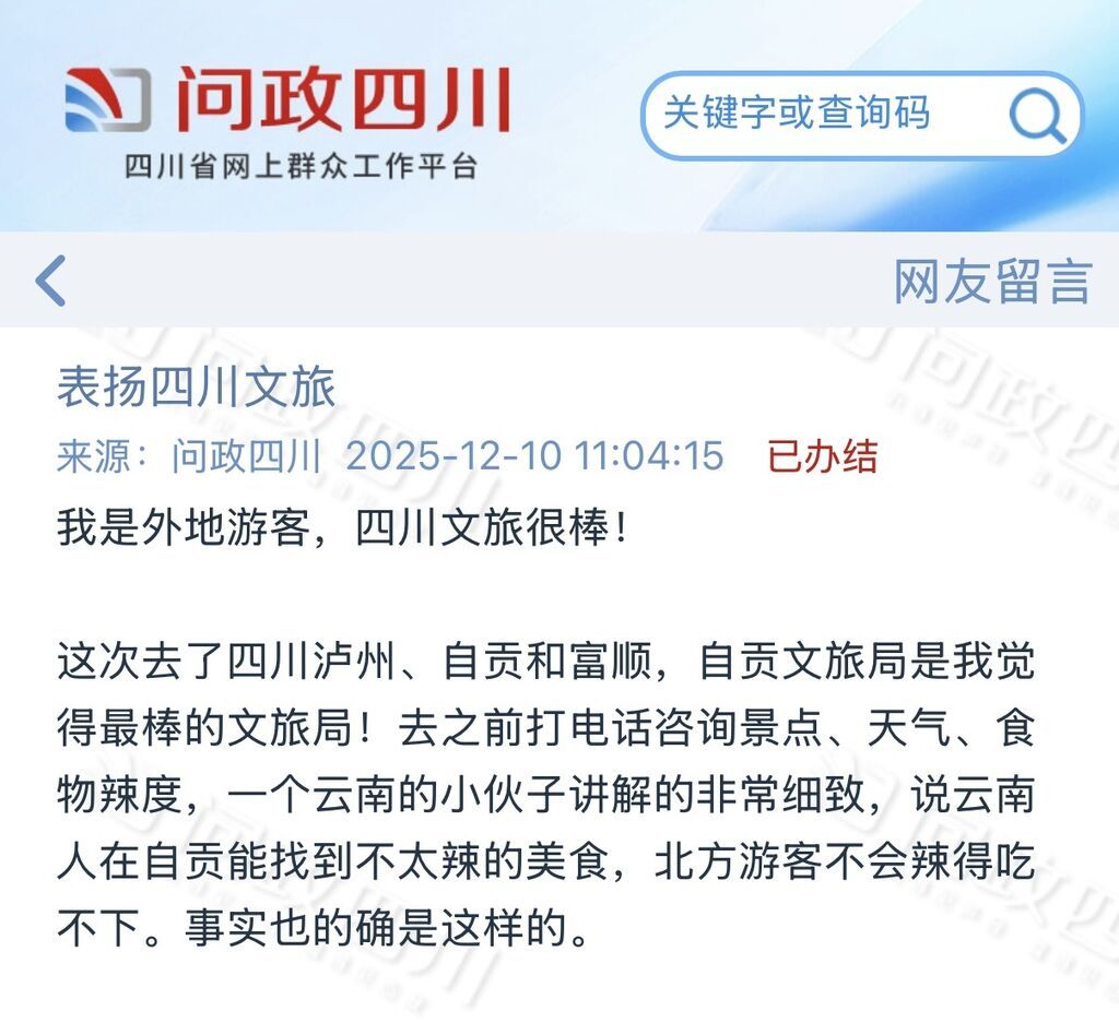 电话上午打的,下午就改了,效率真高!”“希望好好表扬这些部门的工作人员!我还会再来的!”日前,“问政四川”平台上一篇表扬信引发广泛关注,一位网友留言称“自贡文旅局是我觉得最棒的文旅局”。这究竟是为什么呢?  暖心初遇:一通电话开启美好旅程 记者联系上留言网友“颤抖的大肚”。这位来自辽宁的游客,日前和家人一同开启自贡之旅。此次出行,是她首次踏足自贡,尽管出发前在网上查阅了大量攻略,但她仍希望能获取更多当地旅游信息,于是试着拨打了自贡市文化广电旅游局的电话。 让她倍感暖心的是,接线工作人员热情似火。工作人员不仅详细介绍了近期当地的天气情况,还主动考虑到她作为北方游客的口味偏好,推荐了许多不辣的美食。“我本来还担心饮食不习惯,工作人员这么贴心,一下子就打消了我的顾虑。”“颤抖的大肚”说道。 更令她惊喜的是,工作人员还推荐了富顺文庙这一宝藏景点。“本来我们行程里没有这一站,就是听了工作人员的推荐,临时增加了这个行程。去了之后发现,这里果然特别有意思,富顺文庙博物馆也布置得十分用心,这趟真是来对了!”“颤抖的大肚”兴奋地分享着此次意外的收获。 旅途中的一个小插曲,让她对自贡文旅的效率有了更深切的体会。她根据网络攻略前往张伯卿公馆,却发现因维修暂未开放。她随即再次致电反映,希望能在网络平台更新提示信息。“没想到上午打了电话,下午就已经修改好了,必须为这种效率点赞!”正是这些细致暖心的咨询服务和快速务实的问题处理,让她深受感动,专程写下了表扬信。 制度支撑:“首问负责”铸就优质服务 自贡市文化广电旅游局之所以能提供如此优质、高效的服务,背后离不开“机关首问负责制度”的有力支撑。 针对以往工作中可能存在的职责不清、推诿扯皮、响应迟缓等问题,该局于2025年制定并实施了《自贡市文化广播电视和旅游局机关首问负责制度(试行)》。该制度明确规定,凡是服务对象通过来访、来电等方式进行咨询、办理、求助、举报或投诉时,首位接待或受理的工作人员即为“首问责任人”,必须依法依规负责到底,做到“有问必答、有诉必应、有难必帮、有疑必解”。 制度详细规划了从“接待受理”“分类处理”到“回访反馈”的标准化工作流程,对事项进行精准分类,划分为即办类、快办类、协同办理类,并明确了各类事项的办结时限。 特别是涉及游客权益保障等紧急事项,原则上要求30分钟内办结反馈。同时,强调“热情主动、文明礼貌、快速高效、依法依规、全程跟踪”的服务要求,还配套建立了知识库共享、常态化培训、监督检查等保障机制,确保制度落地生根、执行有力,实现服务流程的闭环管理和责任的可追溯。 展望未来:擦亮自贡文旅“金招牌” “首问负责制”的推行,不仅为游客带来了优质的服务体验,更在多个维度产生了积极影响,成为提升城市文旅品牌美誉度的强大引擎。据统计,仅2025年下半年,该局便高效处理各类首问事项400余件。 制度不仅直接提升了游客的满意度和获得感,通过快速响应解决其“急难愁盼”;也优化了文旅营商软环境,以高效规范的政务服务增强了市场信心;同时,倒逼干部职工强化服务意识和业务能力,锤炼了务实作风。每一次高效、专业的服务,都成为一次成功的城市形象推介,为自贡建设独具特色的世界文旅名城积累了宝贵的口碑资产。 资料图真正的城市魅力,既在风景之中,更在人与人相遇时的温暖与效率里。自贡正是通过制度化的暖流与高效,让这份魅力深入人心。 自贡市文化广电旅游局相关负责人表示,下一步将继续坚持并深化“首问负责制”,计划将这一服务理念延伸至全系统及行业一线窗口,形成更大合力;强化数字赋能,升级文旅知识库,探索利用智能技术提供24小时不间断的便捷服务。同时,致力于将“首问负责”打造为自贡文旅服务的核心品牌标识,并通过完善监督评价机制,持续推动服务质量提升,让每一位来到自贡的游客都能感受到更有温度、更具效率的“盐都服务”。 编辑:郑皓匀 编审:韩钰
