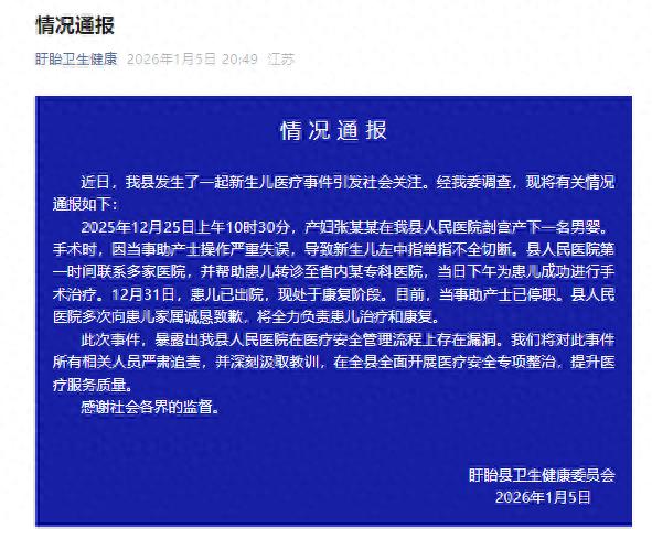 2025年12月25日上午10时30分,产妇张某某在我县人民医院剖宫产下一名男婴。手术时,因当事助产士操作严重失误,导致新生儿左中指单指不全切断。县人民医院第一时间联系多家医院,并帮助患儿转诊至省内某专科医院,当日下午为患儿成功进行手术治疗。12月31日,患儿已出院,现处于康复阶段。目前,当事助产士已停职。县人民医院多次向患儿家属诚恳致歉,将全力负责患儿治疗和康复。