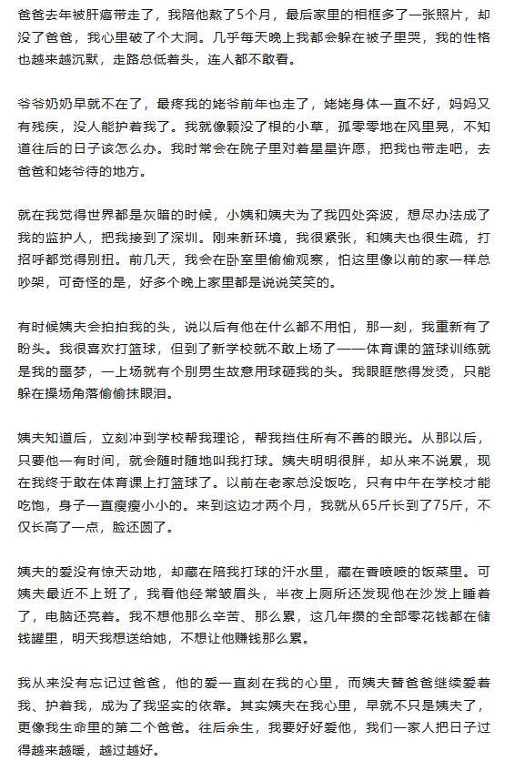 1月3日,“92年小伙看到12岁养女作文后泪崩”的话题冲上热搜,温暖故事感动万千网友。这名出生于1992年的小伙名叫危一,现定居广东深圳。1月2日,他在个人社交平台发布了一段视频,镜头里,他逐字朗读外甥女佳佳写的作文《我的第二个爸爸》,过程中数度哽咽,作文中质朴又真挚的文字,更是戳中无数网友的泪点,这条视频收获超过200万点赞。  视频截图 作文里,佳佳写下了自己的坎坷境遇:在深圳的小姨和姨父四处奔波,最终办理了正式领养手续,成为她的监护人,并将她从山东老家接到深圳生活和学习。佳佳的文字记录了她从最初的孤苦无依、对新环境的陌生与紧张,到逐渐对姨父产生信任与依赖的心路历程。她已将危一视为“第二个爸爸”,甚至心疼他赚钱辛苦,把自己攒了几年的零花钱——共计1321.6元全部送给了他。  佳佳的作文全文 视频意外爆火后,危一和养女佳佳收获全网关注,来自全国各地的关心与鼓励纷至沓来,还有不少人私下联系他,想要转账、寄送物资。对此,危一在1月3日晚再度发布视频回应:“感谢大家的关心,我们目前的能力足以支撑两个家庭的开销,之前工作也攒下一些积蓄,往后我和妻子也会踏实奋斗,把日子过好。”  1月4日,极目新闻记者联系到当事人危一。他坦言,发布这条视频只是想记录生活里的感动瞬间,完全没料到会引发这么大的关注。他同时强调,发视频的初衷绝非卖惨求捐助,“我们靠自己的积蓄,加上政府的补贴,抚养孩子没问题”。 谈及收养佳佳的缘由,危一的语气满是坚定。“是我主动提出来的,没什么犹豫和纠结。”他回忆,那段时间家里接连遭遇变故,两位至亲(佳佳外公和爸爸)相继离世,一家人都沉浸在慌乱与悲痛中。“我觉得作为家里的男人,有责任扛起这份担子,让家人过得更好,所以当即就决定要收养佳佳。”危一坦言,相信换作其他人,遇到这样的情况也会伸出援手。他补充道,佳佳的身世太过坎坷,爸爸、爷爷、奶奶和外公都已过世,妈妈身有残疾,外婆身体状况也不好,家里实在没人能照料她。“我老婆家是两个女儿,没有男丁,我是家里唯一的男丁,这个责任我不担,谁来担呢?”除此之外,危一想给佳佳一个更广阔的天地,“就算她妈妈有能力抚养她,我们也想把她接到大城市,让她见见世面。”  佳佳生活照(受访者提供) 危一告诉极目新闻记者,这篇作文是妻子先发现的,随后拿给自己看。“我一读就忍不住了,尤其是看到她要把攒了这么久的零花钱给我,心里又暖又酸。”他感慨,孩子的压岁钱和零花钱本就不多,却把这份心意看得比什么都重。更让他动容的是,自己平日里的点滴付出,佳佳都默默记在了心里。前段时间,危一失业后转型做自媒体,整日待在家中。佳佳中午、晚上放学回家,察觉到他的状态和以往不同,便悄悄问小姨:“姨父怎么了?”妻子安慰孩子,说姨父只是压力大,让她专心上学就好。“我怎么也没想到,孩子把这件事写进了作文里。”危一坦言,在他看来,这不过是一个男人应尽的责任,“两个家都是家,都得用心维护,这是天经地义的事。” 在照顾佳佳这件事上,危一有着自己的育儿理念——“女儿要富养”。“我带她体验了很多人生第一次,比如爬山、开卡丁车、吃火锅等。”他解释道,所谓的“富养”,不仅仅是物质上的满足,更重要的是精神上的陪伴和滋养。他尽自己最大的努力对她好,也是希望她以后能够明辨是非,不轻易被别人的小恩小惠所欺骗。危一透露,自己本身就十分喜欢孩子,妻子怀孕时,他便翻阅了不少育儿书籍。“我一直认同‘孩子是父母的复印件’这句话,也希望能通过自己的陪伴,弥补佳佳缺失的关怀。”  佳佳生活照(受访者提供) 危一还提到,佳佳也看过那条爆火的视频。1月2日放假在家,她一整天都在翻看网友的评论,眼眶泛红,却强忍着没哭,心里满是感动。他欣慰地说,以前的佳佳胆子特别小,在商场里想上厕所,都不敢去服务台询问,如今的她变得开朗大方,也敢于表达自己的想法。危一有一个3岁的儿子,佳佳对弟弟格外疼爱,姐弟俩相处得十分融洽,“两个孩子一起长大,能互相陪伴,也会变得更开朗,更懂得分享。”  1月5日,极目新闻记者注意到,危一的自媒体账号目前已有9.9万粉丝,共发布了3条视频。账号简介里写着:“在南山做了6年的房产总监,放下领导情结,从零开始,听老婆话,挑战自己,学习做自媒体。”危一表示,自己原计划做房地产相关的内容分享,如今看到这么多网友关心佳佳的成长,他也萌生了新的想法,或许会记录孩子成长的重要时刻,比如生日、打篮球的瞬间等,不过目前还没有最终确定。 至于佳佳送给他的1321.6元零花钱,危一表示,这笔钱他既不会用,也舍不得用。“我打算好好存起来,等到以后某个特别的时刻,再原封不动地还给她。”这个小秘密,他至今还没告诉佳佳。  佳佳生活照(受访者提供) 据《第一现场》报道,佳佳曾坦言,是姨父一家人无微不至地照顾,让她对生活重拾希望。2025年9月,她在深圳市福田区顺利入学。在佳佳心中,她早已把姨父一家当成了自己的第二任父母。“我的零花钱攒了两三年,虽然有点舍不得,但我就是想拿出来支持姨父的事业。”佳佳说,“我的爸爸以前也很疼我,现在姨父接过了爱我的责任,所以,他就是我的第二个爸爸。” 据央视网报道,34岁的危一原籍山东,现在深圳生活。2024年,佳佳11岁时,其父亲因肝癌去世,母亲身有残疾