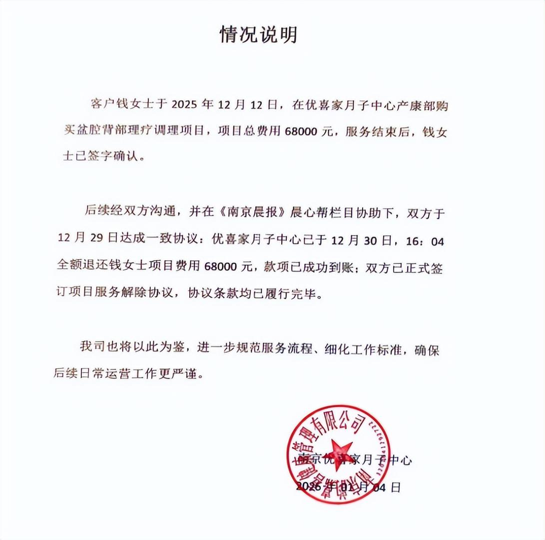 随后,优喜家月子中心也给记者发来了一份情况说明,在说明中,优喜家月子中心表示:客户钱女士于2025年12月12日,在优喜家月子中心产康部购买盆腔背部理疗调理项目,项目总费用68000元,服务结束后,钱女士已签字确认。后经双方沟通,并在《南京晨报》晨心帮栏目协助下,双方于12月29日达成一致协议,优喜家月子中心已于12月30日全额退还钱女士项目费用68000元,款项已成功到账,双方已正式签订项目服务解除协议,协议条款均已履行完毕。我司也将以此为鉴,进一步规范服务流程,细化工作标准,确保后续日常运行工作更加谨慎。 来源:南京晨报