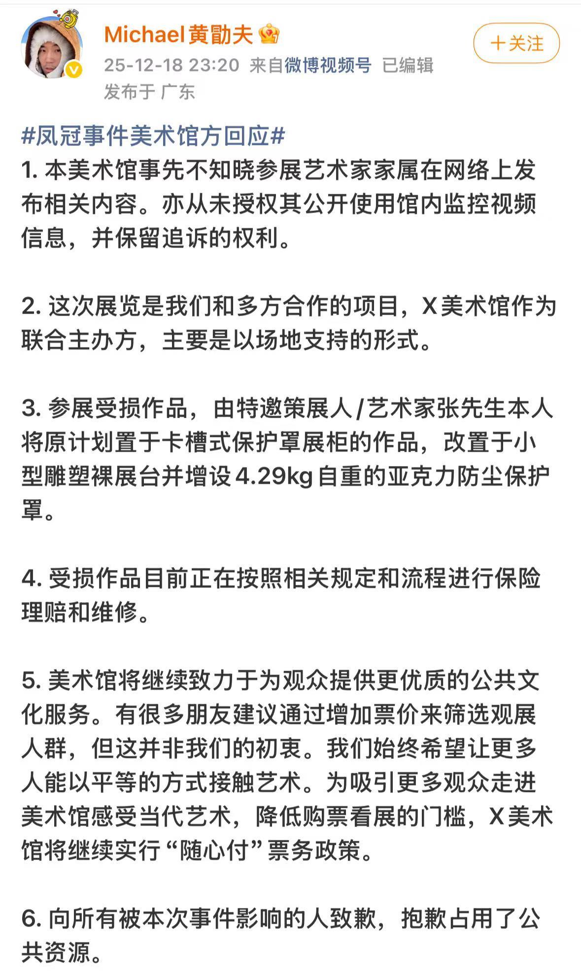 极目新闻记者 张皓 见习记者 李淑仪 1月6日下午3时,千万粉丝网红张凯毅发视频称,“取证完成,提交立案,真相交给法律。”这是她在“黄金凤冠”事件后再次发声,也是2026年发布的第一条视频。张凯毅在视频中表示,目前已全部完成了造谣证据的公证与保全,正式向法院提起诉讼,并称即日起将正式恢复更新。  张凯毅发布视频截图 据极目新闻此前报道,2025年12月13日,千万粉丝网红博主张凯毅发视频称,丈夫在结婚时为她亲手打造的4斤重黄金凤冠,在自己办的免费展览上被人为破坏了。视频中,一男孩在观展时反复抱住展台柜子,并上手触碰,随后凤冠与展罩一起掉在地上。  张凯毅此前视频截图 该视频引发网友热议,有网友认为,必须要让对方赔偿。也有网友觉得,小孩不是故意的,也没用力碰,展柜保护罩存在问题。 随后,张凯毅回应称,发视频不想去指责一个孩子,但没办法接受“孩子小所以没错”“是展品摆的不对”这种说法,“我们从事发到现在从未向小孩家索赔,因为有上保险,视频的初衷就是问问有经验的网友如何定损,因为这东西是独一无二的无法估价,没想网暴谁,更没什么‘钓鱼引流’的心思。”  张凯毅此前视频截图 张凯毅回应视频发布后,再次引发网友热议,有网友认为是布展时没有做好防护措施。2025年12月14日,张凯毅的私信及评论已关闭。2025年12月18日,X美术馆创始人“Michael黄勖夫”发文回应“凤冠被毁”事件,称张凯毅丈夫更改了放置凤冠的展台,“参展受损作品,由特邀策展人/艺术家张先生本人将原计划置于卡槽式保护罩展柜的作品,改置于小型雕塑裸展台并增设4.29kg自重的亚克力防尘保护罩。”  X美术馆创始人发文回应 1月6日下午3时,张凯毅在事件风波后再次发布视频称,“近期网上有人将黄金凤冠事件加工成‘网暴开盒’‘假黄金’‘骗保’等一系列刑事罪名指控后,又借此事件继续造谣、诽谤我和家人。”她表示,目前已全部完成了对造谣证据的公证与保全,并正式向法院提起诉讼。张凯毅称,“真相不在口水里,在证据和法律文书里。”她还在视频末尾中表示,即日起将正式恢复更新。 极目新闻记者发现,张凯毅视频评论区已经可以正常发布评论,但私信功能仍未恢复。目前,张凯毅账号中有关“黄金凤冠”的相关视频已查询不到。 6日下午,记者拨打天眼查上张凯毅名下的传媒公司电话,显示为空号。 (来源:极目新闻)