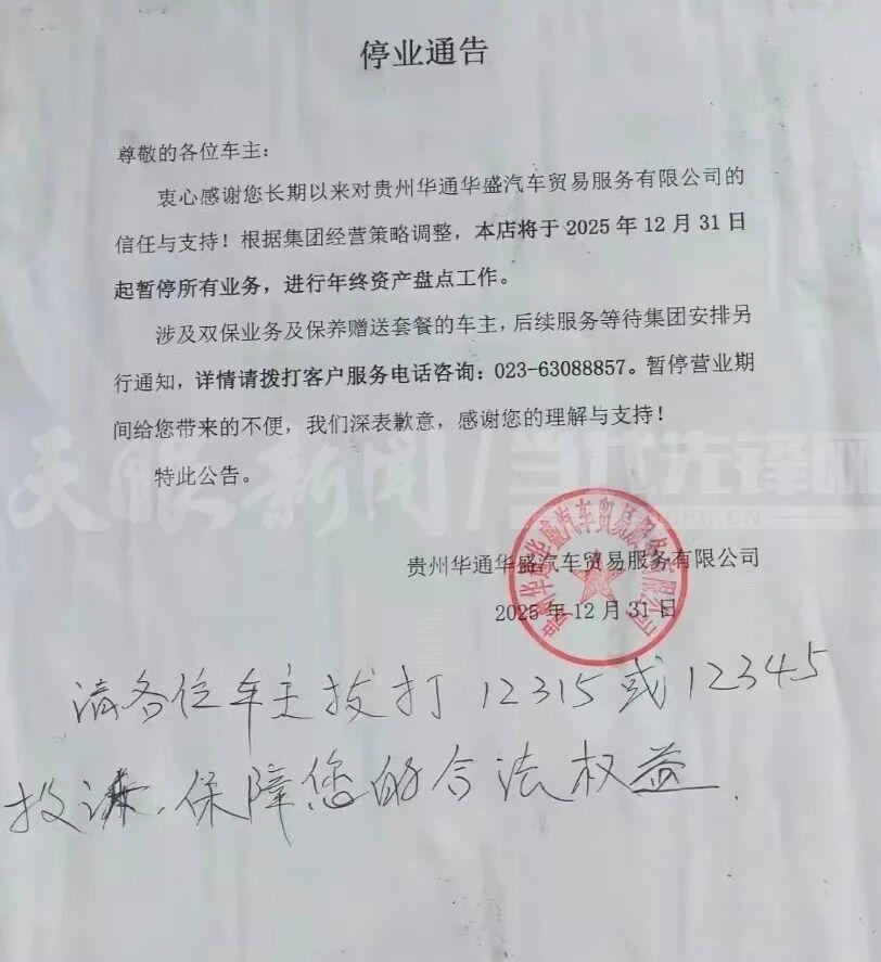 4S店门口保安亭张贴着《告知函》和《停业通告》 杨先生告诉记者,网传“跑路”情况不属实,2025年12月31日相关公告已显示,闭店是由于集团经营业务策略调整而暂时关停;“双保无忧”服务(其为广汇集团旗下提供的特有保养服务)预计2026年2月初恢复服务;保养赠送套餐问题需要进一步核实后等待集团安排另行通知;详情可联系客户服务热线023—63088857进行解释说明。 “目前,店面未安排工作人员进行留守,如有疑问可以致电联系。”杨先生补充道,后续也将积极配合职能部门处置善后事宜。同时,温馨提示广大消费者,在工作日上班时间拨打客户服务热线时,如遇不通或占线的情况,多拨打几次,该公司会安排工作人员进行及时处置。 来源:贵州日报天眼新闻