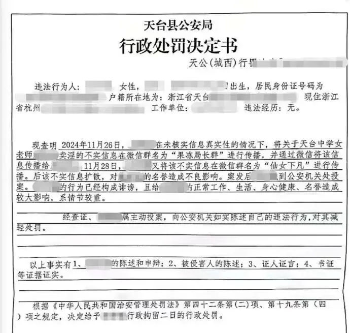 2024年11月,一则关于浙江台州天台县某中学女教师“卖淫被抓”的传言在微信群中流传,后被天台县公安局确认不实。因在两个三人微信群及与两位好友的微信私聊中谈及该传言,林淼被处以行政拘留两日。
