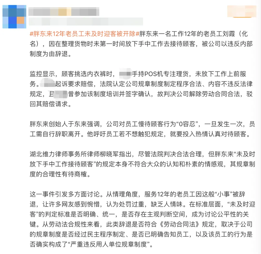 2025年,一则“胖东来辞退12年老员工”的新闻冲上热搜。原因并非业绩不达标,而是该员工一次“未及时接待顾客”,违反了公司的服务制度。哪怕这位员工已在公司服务12年,胖东来依然依据内部规定解除了劳动合同,并最终赢得了相关劳动诉讼。
