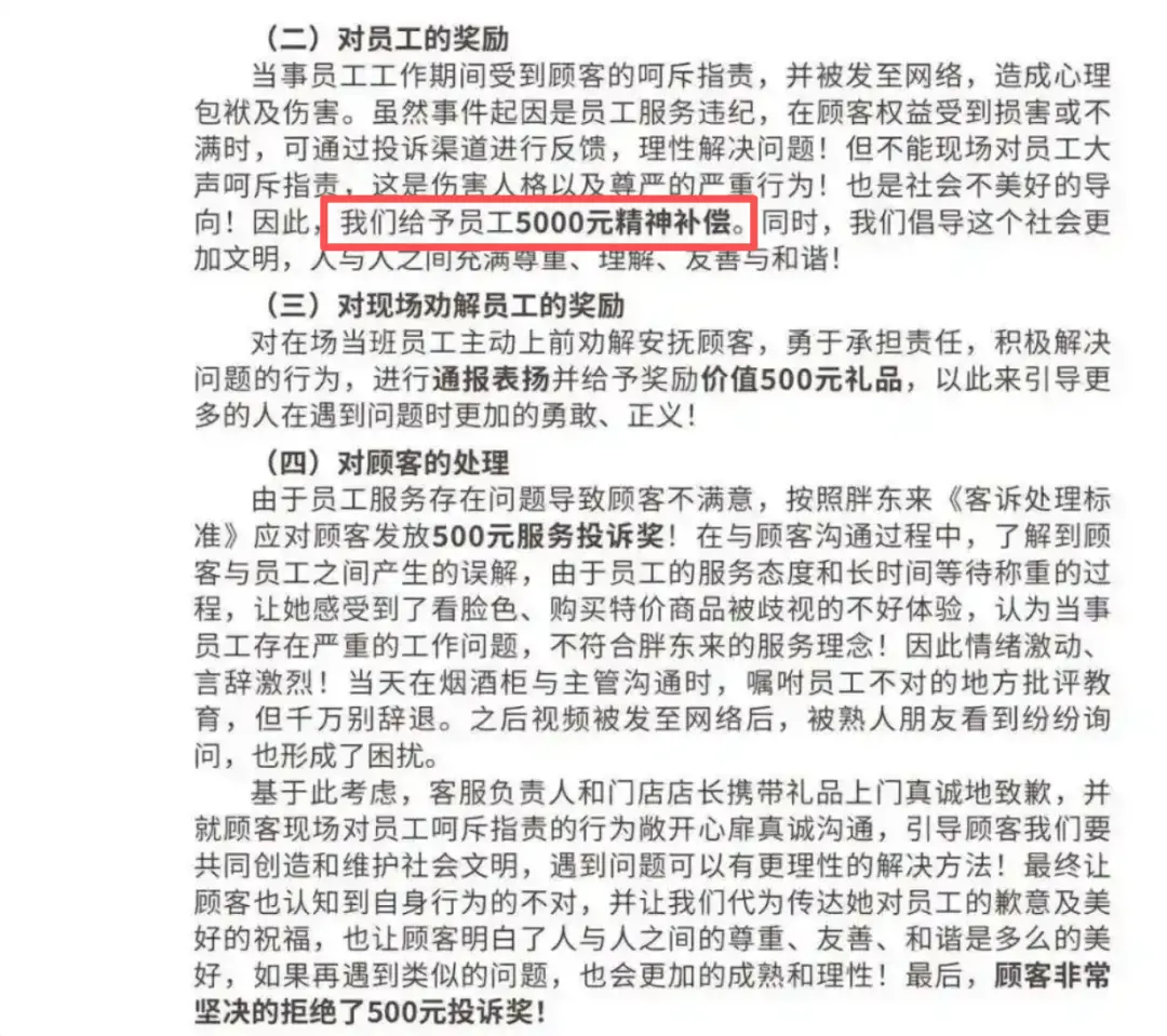 公司设有“委屈奖”,员工如果在工作中受到无理的委屈,公司会发钱补偿。更夸张的是有一次,在处理完一场顾客纠纷后,公司在向顾客道歉的同时,竟然转头给自家被卷入事件的员工发了5000元“精神补偿金”。