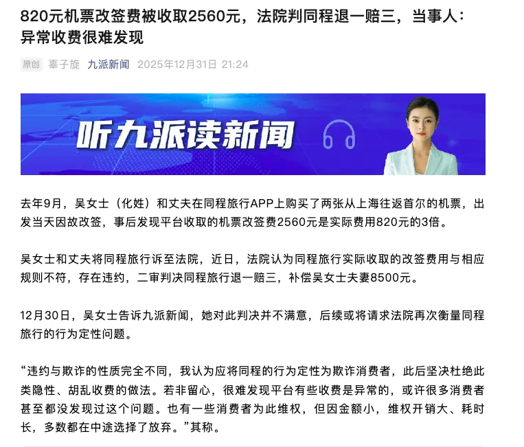 吴女士的案子是教科书。820元的实际改签费,平台收2560元。法院判了退一赔三,同程可能觉得这不过是笔“合规成本”。毕竟,一百个吴女士里,有几个会坚持起诉?他们算准了你耗不起时间、搞不懂流程、咽得下委屈。