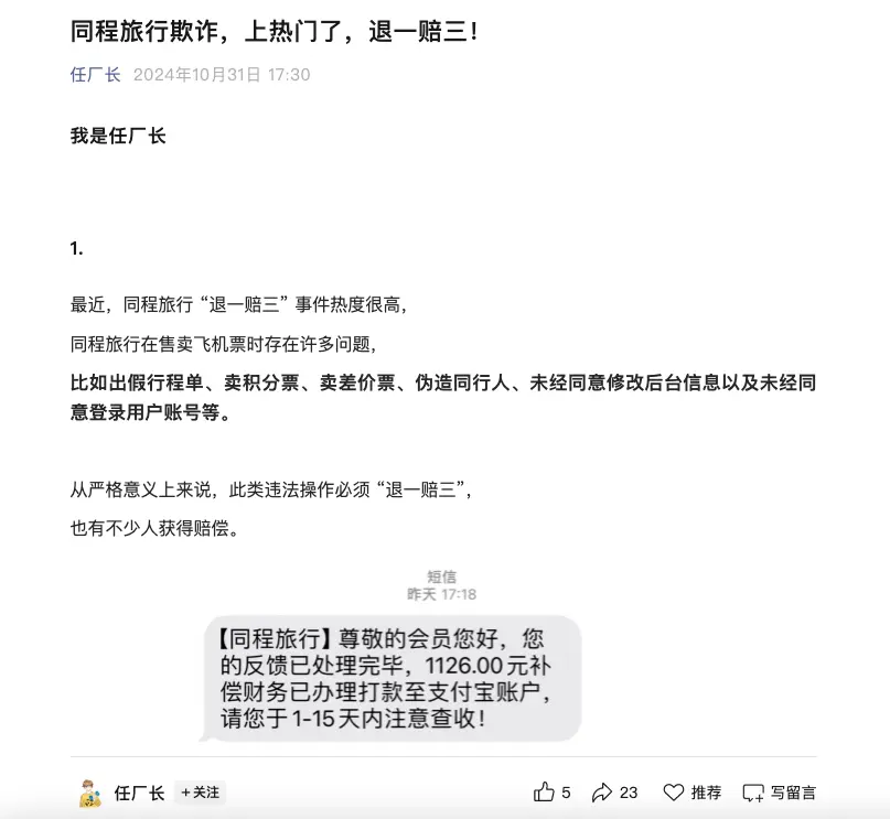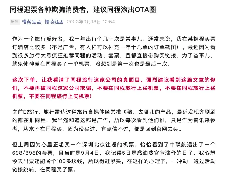 这哪儿是个别案例,这简直是同程旅行给全国消费者开的一场欺诈博览会,不知多少用户的信任和人民币就这样被同程套路了。