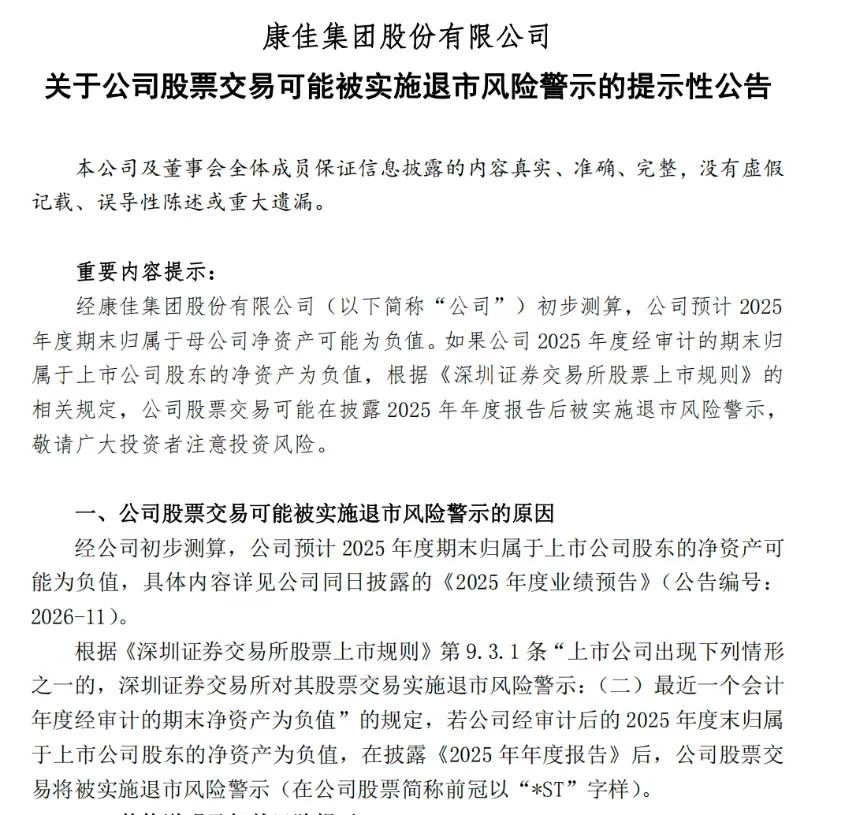 更为严峻的是,康佳同时发布了公司股票交易可能被*ST的提示性公告,根据公告,公司预计2025年度期末归属于母公司净资产可能为负值,公司将面临退市风险。
