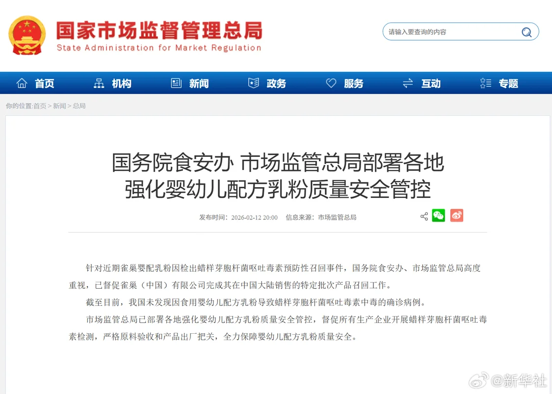 市场监管总局已部署各地强化婴幼儿配方乳粉质量安全管控,督促所有生产企业开展蜡样芽胞杆菌呕吐毒素检测,严格原料验收和产品出厂把关,全力保障婴幼儿配方乳粉质量安全。(国家市场监督管理总局)