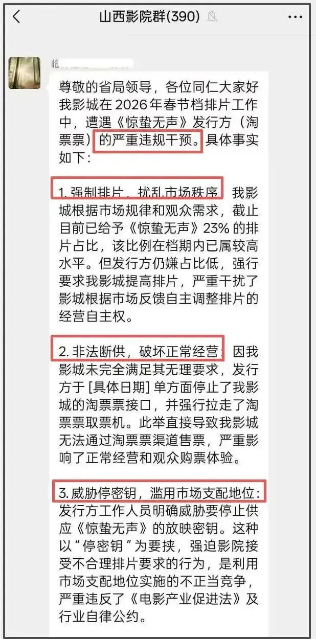 2026年的春节档,本该是《惊蛰无声》用光影惊动市场的时刻,没想到先被惊动、并且响声震天的,是来自山西数百家影院的联名控诉。
