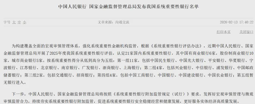 2月13日,中国人民银行、国家金融监督管理总局发布2025年度我国系统重要性银行名单,认定21家国内系统重要性银行,其中国有商业银行6家,股份制商业银行10家,城市商业银行5家。
