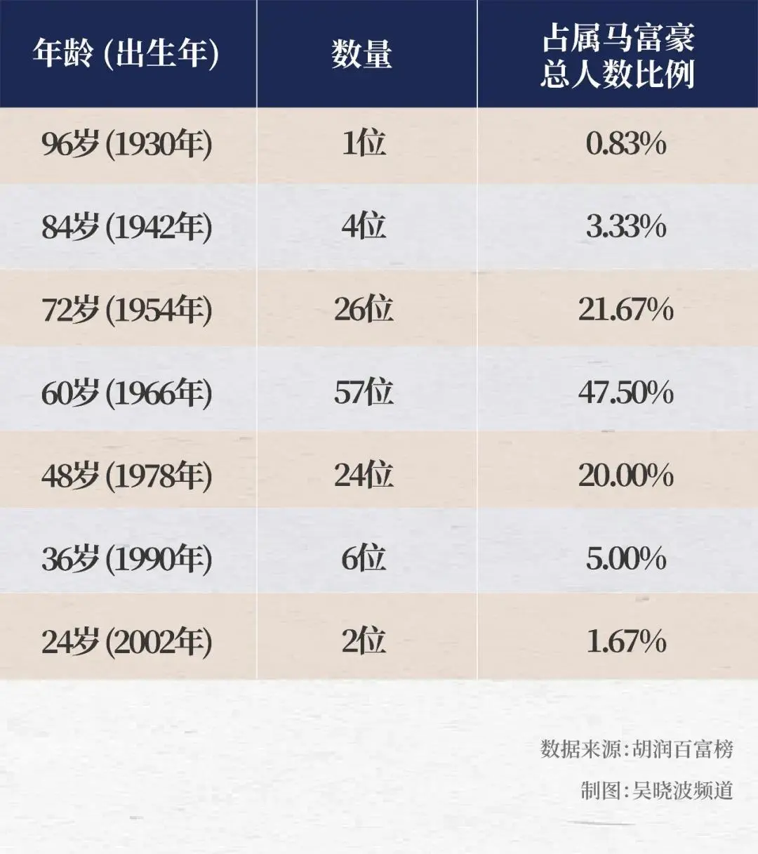 他们赶上了第二波婴儿潮,其青壮年时期恰与中国市场化改革、全球化及互联网浪潮高度重合。当“胆子再大一点”的时代先声划破沉闷,这些身兼知识储备与野心的奋斗者,便在庞大的人口基数中脱颖而出。婴儿潮决定了企业家池子的规模,改革开放与产业升级则是财富暴涨的引擎。