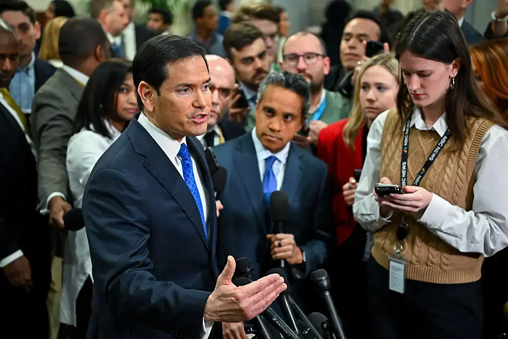 3月3日,美国国务卿鲁比奥在国会大厦对媒体发表讲话。(图源:彭博社)
