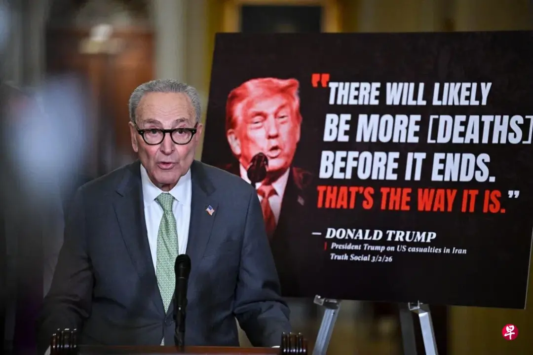 美国参议院少数党领袖舒默指责特朗普将美国卷入一场大多数民众反对的战争。(图源:彭博社)